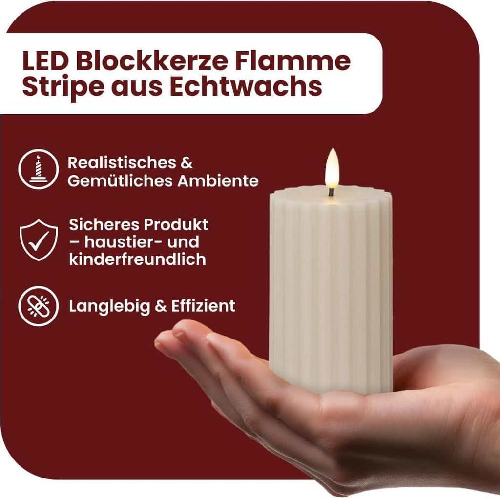 Sichere Nutzung: Die LED-Technologie eliminiert offene Flammen, minimiert Brandrisiken und macht die Teelichter sicher für Haushalte mit Kindern oder Haustieren. 4cm - Leuchtmittel: je 1x LED - imitieren eine natürliche Flamme (Flackereffekt) - Kerzendocht erkennbar - Stromversorgung: je 2 Knopfzellen CR2032 (im Lieferumfang enthalten) - Schalter mit am Kerzenboden - Timerfunktion: 6 Stunden an, 18 Stunden aus (automatisch) - Schutzklasse: IP20 - nur für Innenbereich geeignet - alle Angaben lt. Batteriebetrieben und flexibel platzierbar, sorgen sie für eine stimmungsvolle Beleuchtung das ganze Jahr über, ob allein oder in Kombination mit anderen Kerzen. Authentische Atmosphäre: Die realistische Wachsspiegeloptik und der Flackereffekt schaffen eine einladende Stimmung, die echte Kerzen imitiert – ideal für romantische Abende oder festliche Anlässe. Dank Timer leuchten sie 6 Stunden und schalten sich für 18 Stunden aus. Vielseitige Einsatzmöglichkeiten: Batteriebetrieben und flexibel einsetzbar, eignen sich die Teelichter für Tische, Windlichter oder dekorative Arrangements – perfekt für jeden Anlass. Ihre Wachsspiegeloptik und der realistische Flackereffekt schaffen eine authentische Kerzenatmosphäre – sicher und komfortabel. LED-Echtwachs-Kerze "Flamme Flow", 2er Set beige, je 4x5cm, Timer inkl. Batterie - • Farbe: Beige • Maße: je 4x5cm • Batterie enthalten • 2 batterien CR2032 inkludiert • mit Timerfunktion ( 6h/18 Repe Teelichter Led Mit Timer Star Trading LED-Echtwachs-Kerze "Flamme Flow", 2er Set Beige Stabkerzen Led Kurz 5cm - Durchmesser: ca. Batterie - • Farbe: Beige • Maße: je 4x5cm • Batterie enthalten • 2 batterien CR2032 inkludiert • mit Timerfunktion ( 6h/18 Repe Battery light Flame Flow 12.5cm - Ullared Lantmän Die LED-Wachskerze überzeugt durch ihr warmweisses Licht und die dreiflamige Optik, die gemütliche Atmosphaere schafft. Lieferung war püntklich und alles war wie erwartet