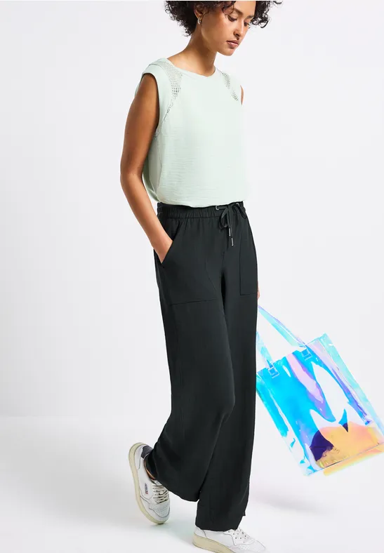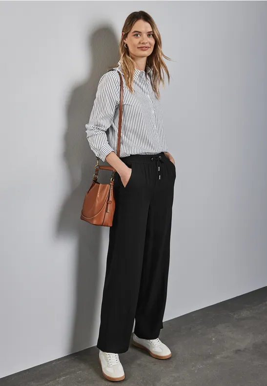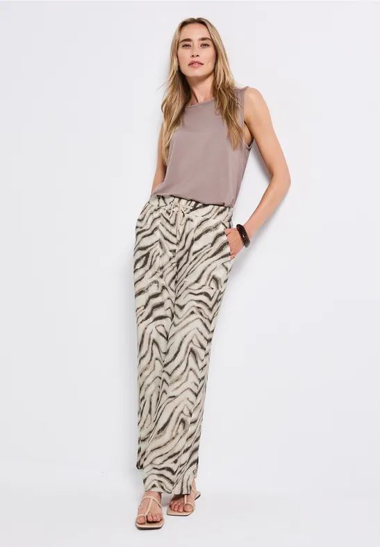 Gemusterte Strukturhose im Loose Fit Sommerhose Street One Street One WIDE LEG CREPE HOSE - Trousers - Beige - Zalando Street One Gemusterte Wide Leg Hose Diese gemusterte Strukturhose von Street One für Damen bringt frischen Wind in deinen Kleiderschrank. Diese Wide Leg Hose von Street One für Damen vereint trendiges Leo-Design mit einem bequemen Casual Fit. Der hohe Bund mit Knopfdetail und die weit geschnittenen Beine setzen ein modisches Statement und bieten gleichzeitig hohen Tragekomfort. Seitliche T... Weich fallend und modisch – dein neues Lieblingsstück! High Waist und Wide Legs, Seitliche Taschen STREET-ONE Wide Leg Hose für Damen in Grün - BONNY | STREET-ONE Wide Leg Twill Hose für Damen in Schwarz - EMEE Diese Wide Leg Hose von Street One für Damen vereint trendiges Leo-Design mit einem bequemen Casual Fit.