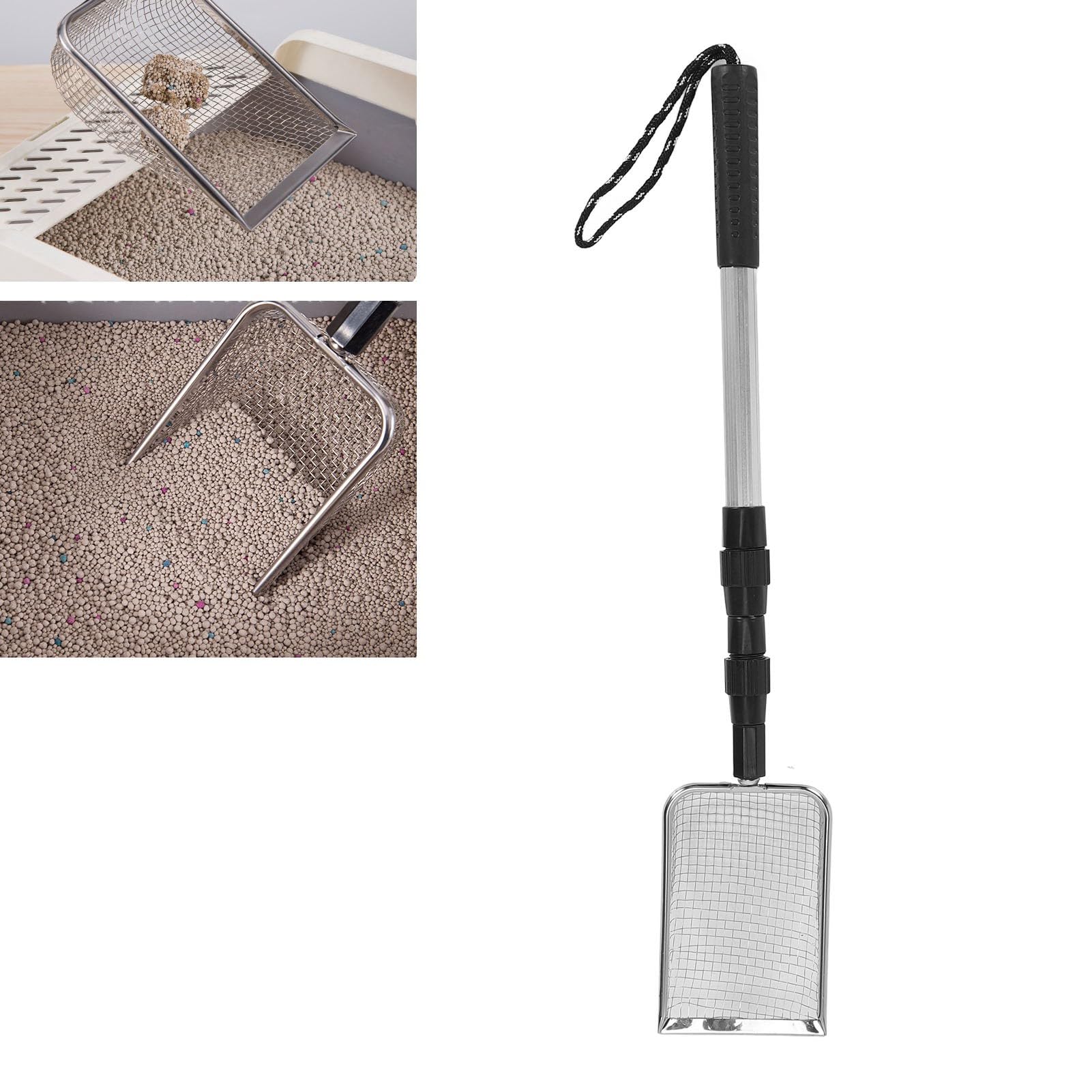 Sorandy Hühnerkot Schaufel, Langstielige Streuschaufel Edelstahl Katzenstreuschaufel Mit Verstellbarer Länge Hochleistungs Antihaft Katzenstreu Sieb Für (B Typ, 3 Teleskopgriffe, 106 X