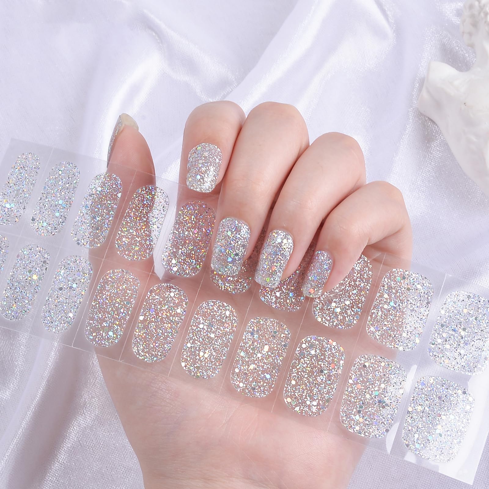 Ceboic 22PCS UV Gel Nagelfolien - Halbgehärtete UV Gel Strips - Selbstklebende Gel Nagellack Streifen - Langanhaltend Gel Nail Stickers French Gellack Wraps Für Finger & Fußnägel (Weiß Glitzer