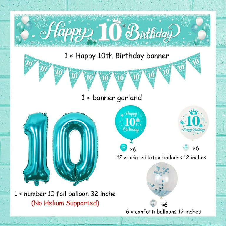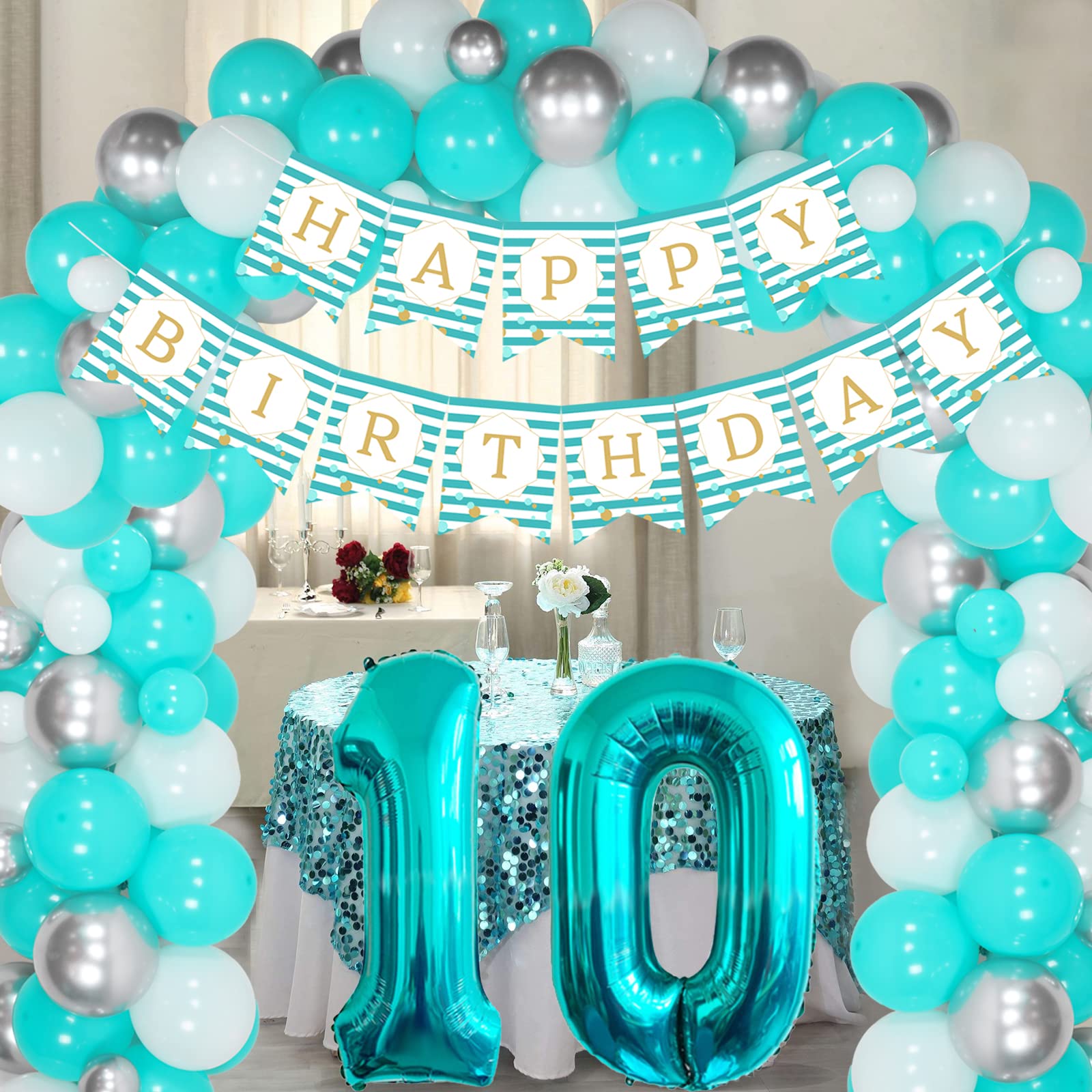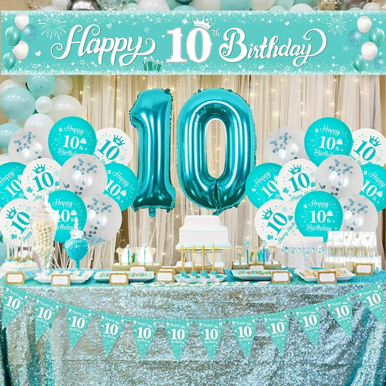 Sursurprise 10th Birthday Decorations For Girls Teal Blue White And Silver Balloon Garland Arch Kit Turquoise Happy Birthday Banner Number 10 Foil Balloon For 10 Year Old Birthday Party Supplies