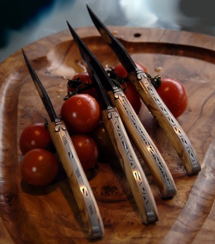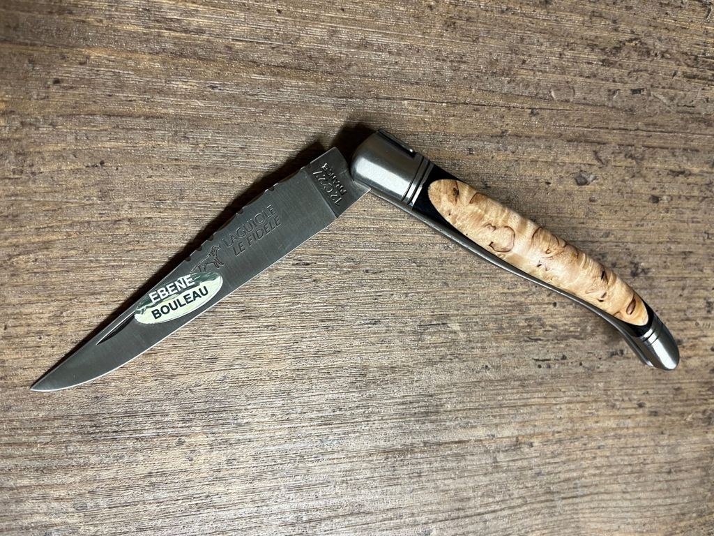 Die Struktur und Maserung sind sehr ausgeprägt. Taschenmesser - Coutellerie LE FIDELE @exklusive Messer |Scheren|Bestecke|Maniküreinstrumente Länge Klinge (Schneidefläche ohne Fehlschärfe): 9,3 cm Ebenholzbaum und Olivenbaum, zwei schon in der Antike verehrte Bäume, gaben Ihr wertvolles Holz für die schwer ausgelegten Griffschalen dieses Laguiole Messers und machten es zu einem einzigartigen Sammlerstück! Länge Griff: 12,0 cm , 12C27 Stahlklinge , Handmade in France Europäisches Hartholz mit sehr hohem Anteil an ätherischen Ölen. Laguiole Le Fidele Taschenmesser Olivenholz 105,44 EUR * * inkl. ges. MwSt. zzgl. Versandkosten Laguiole Le Fidele Taschenmesser Büffelhorn 120,90 EUR * * inkl. ges. MwSt. zzgl. Versandkosten Le Fidele Laguiole Taschenmesser Nr. 72362 Laguiole Taschenmesser Olivenholz (geschmiedet) Ein traditionell französischer Zweihand-Folder im ... weiterlesen Artikel-Nr.: 72334 Fabrice Lefort kombiniert in seiner neuesten Zeichnung die Agilität und Wendigkeit eines Drachen mit der Schärfe einer Klinge. Die Unterschiede zur Classic-Edition sind: breitere Rückverzierungen die Klinge ist bis zur Spitze verziert das Messer ist etwas voluminöser Griff aus 2 Komponenten: Ebenholz und Olivenholz Griffschalen aus Ebenholz und Olivenholz Ebenholz bezeichnet das Holz der zur Familie der Ebenholzgewächse gehörenden, hauptsächlich in den Tropen Ostindiens und Afrikas heimischen Gattung Ebenholzbäume (Diospyros - Dattelpflaumen mit ca., 120 Arten). Es zeichnet sich durch sehr gute Feuchtigkeitsresistenz aus, ist eines der schwersten, härtesten und widerstandsfähigsten Hölzer., Griffkombination Ebenholz/Olivenholz Laguiole En Aubrac Original Laguiole - Taschenmesser Le Fidele, Edition EMMAS SEELE 02 Laguiole Le Fidele Olivenholz wird meist aus der spanischen Provinz Andalusien importiert. Das Design wird auf der Rückseite der Klinge per Lasergravur angebracht.