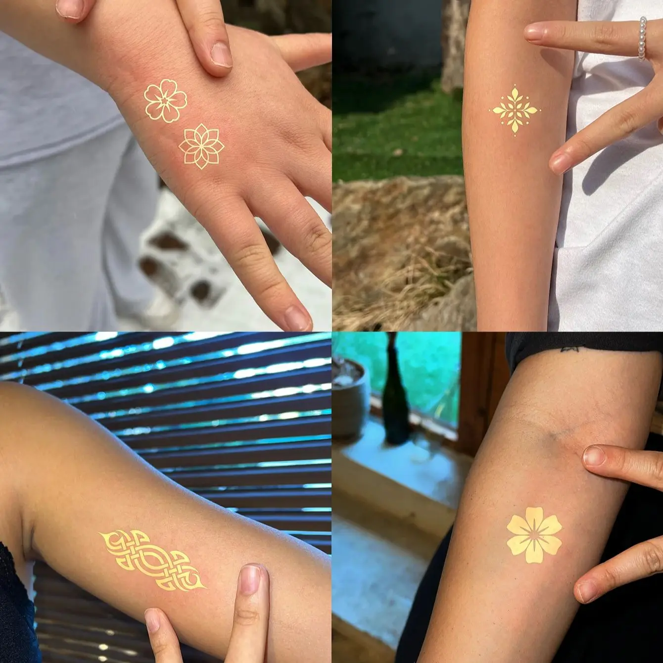 3-7 Tage getragen werden. Stars wie Beyonce lieben sie und auch Blogger wie Aimee Song haben die schicken Flash-Tattoos bereits für sich entdeckt: Flash Tattoos sind metallisch glänzenden Bildchen, mit denen man sich die Haut für ein paar Tage verschönern kann. Blitzversand, Deutscher Händler, keine Zollgebühren Mehr als 400 Motive in unserem Shop Lieferung 1 Blatt Flash Tattoo in 1-2 Werktagen Pearls And Dents Flash Einmal Temporary Klebe Tattoo Rose Schwarz Weiß Körper Body Tattoo Fasching FLASH EINMAL TEMPORARY Klebe Tattoo Gold Schwarz 7teile Armband Hals Kette G9 - EUR 113,49. ZU VERKAUFEN! Weichen Sie die Tattoos auf der Haut mit Baby-Öl oder Olivenöl für 282588985174 Das temporäre Tattoo ist etwas ganz Besonderes. Flash Tattoo Metallic Temporary Einmal-Tattoo Henna Klebe Gold Feder... Sorgen Sie dafür, dass Ihre Haut vor dem Aufbringen des Tattoos sauber, trocken und frei von Ölen ist, ansonsten hält das Tattoo nicht! Legen Sie das Tattoo nach unten auf die Haut und halten Sie ein feuchtes Tuch für etwa 30 Sekunden darauf. Durch eine Vielzahl von Motiven sind Ihrer Kreativität keinerlei Grenzen gesetzt und machen die Haut zu einem Juwel. Klopfen Sie sanft auf das nasse Tuch und ziehen Sie langsam das Papier ab. Wasserfest, Haltbarkeit 3-7 Tage - Beliebig Kombinierbar, auch einzeln anwendbar Positionieren Sie das Tattoo auf Ihrer nicht verdrehten oder gestreckten Haut. Flash Tattoo Metallic Temporary Einmal Klebe Tattoo Gold Totenkopf Rosen Sterne Biker Eidechse Gitarre Skull Armband Kette P1351 Der neue aktuelle Celebrity Trend - Super Qualität 23cm x 15 cm Mit diesen Motiven auf Ihrer Haut werden Sie alle Blicke auf sich ziehen. Flash Tattoos passen zu jedem Anlass, egal ob auf Partys im Club, am Strand, auf Konzerten, Festivals oder einfach in der Freizeit.