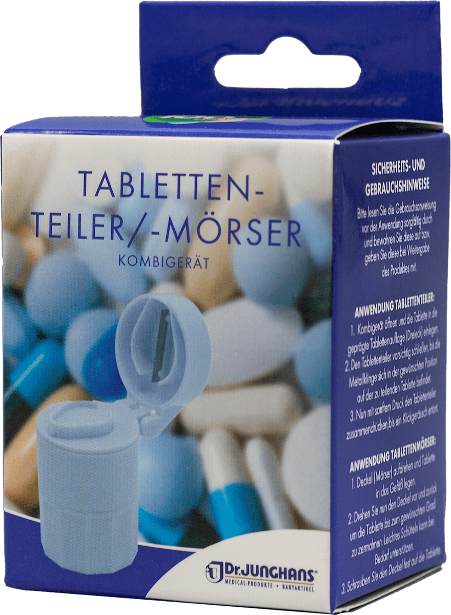 Pillenteiler Tablettenteiler Med-Comfort Tabletten-Teiler Zum Einfachen Teilen Von Tabletten- Blau Kaufen Bei Tabletten Zerkleinern Einfache BedienungKonzipiert für Benutzerfreundlichkeit mit geringem Kraftaufwand beim Zerteilen der Tabletten. Bort GmbH Produkte hier online kaufen FarbeAnsprechendes Design in Blau und Transparent, passend zu verschiedenen Einrichtungsstilen. Die richtige Dosis auf einfache Weise: Ein hochwertiger Tablettenteiler ist unverzichtbar, um Medikamente präzise zu portionieren und Deine Gesundheit optimal zu unterstützen Tablettenteiler 1 St - Shop Apotheke Dank des durchdachten Designs lässt sich der Tablettenteiler/-mörser nach Gebrauch einfach reinigen. Die Kombination aus robustem Kunststoff und einer scharfen Edelstahlklinge gewährleistet eine lange Lebensdauer und effizientes Arbeiten. FarbeAusführungDurchmesserHöhePZNEAN/GTINArtikelnummerInhaltblau/transparentTablettenmörser aus Kunststoffca.5 cmca.