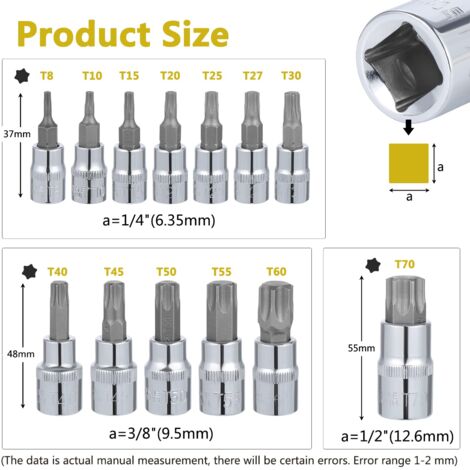 Noosverl 13 Stück Torx Bit Socket Set T8-T70 S2 Stahl Steckschlüssel Sechskant Torx Socket Shank Tool Schraubendreher Bit Set, Torx männlich T8 T10 T15 T20 T25 T27 T30 T40 T45 T50 T55 13-teiliges Torx-Bit-Steckschlüsselsatz, T8-T60 Bit Set, S2 Stahl Bits und Cr-V-Nüsse, mit Aufbewahrungskoffer, 1/4, 3/8 und 1/2 Antrieb Stahl: Die Bits sind alle aus hochwertigem legiertem S2-Stahl gefertigt, der eine außergewöhnliche Härte und Rostbeständigkeit bietet 【Spezifikation】13 Stück Torx-Bit-Stecknuss 38 mm T8 1/4-Antrieb, 38 mm T10 1/4-Antrieb, 38 mm T15 1/4-Antrieb, 38 mm T20 1/4-Antrieb, 38 mm T25 1/4-Antrieb, 38 mm T30 1/4-Antrieb. 4 Antrieb, 5 0 mm T40 3/8 Antrieb, 50 mm T45 3/8 Antrieb, 50 mm T47 3/8 Antrieb, 50 mm T50 3/8 Antrieb, 50 mm T55 3/8 Antrieb, 62 mm T60 1/2 Antrieb Zuverlässiger Kundenservice: Protorq bietet zuverlässigen, effektiven und effizienten Kundenservice. 【Schlaggrad】 Diese schlagfesten korrosionsbeständigen Antriebs-Bits sind für Schlagbohrschrauber konzipiert, halten Korrosion und bieten Haltbarkeit in schweren Umgebungen. LEXIVON Torx Bit Steckschlüsselsatz 13-teiliges Tamper Resistant T8H - T60H bit set, fur Drehmomentschlüssel, Bohrer, und torx schrauben, passend LEXIVON Torx Bit Steckschlüsselsatz, Größen 【Überlegene Passform】 Jeder Bit verfügt über eine präzisionsbearbeitete Spitze für idealen Sitz in Schraubenkopfmulden, was zu weniger abisolierten Schrauben führt. Klein Knurled Torx Bit Socket 13-teiliges Komplettes Torx- Und Innensechskant-Steckschlüssel-Set Mit Schraubendreher Und Bit-Aufsätzen – Inkl. Größen T8–T70 Für Vielseitigen Einsatz Torx Mit Loch