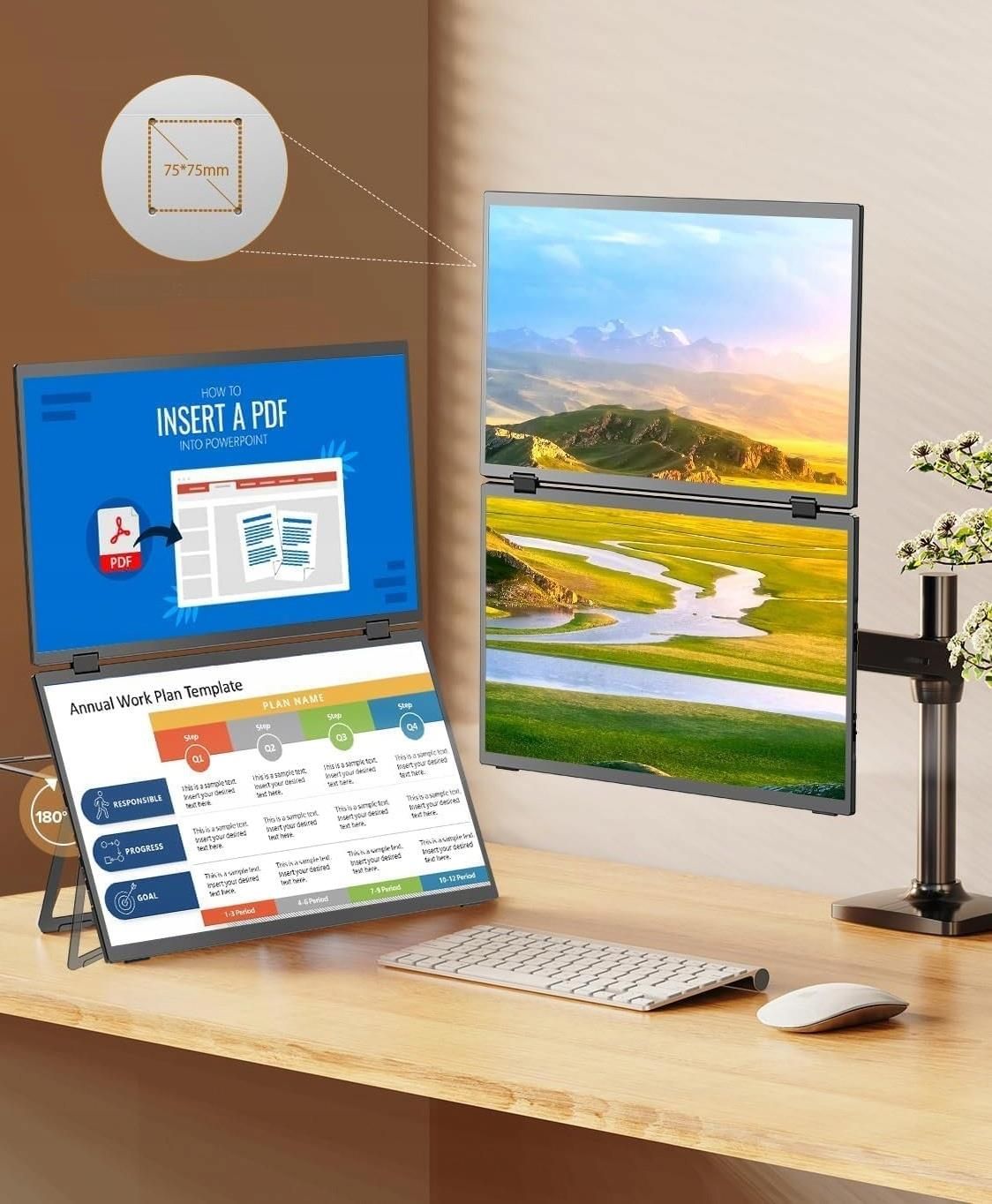 Die UPERFECT Delta Monitore bieten dir eine perfekte Kombination aus Kreativität und Leistung, die ideal für alle Technikliebhaber und Profis ist. Jedes Modell überzeugt mit einer beeindruckenden Bildqualität und durchdachten Funktionen, um dir das Arbeiten und Spielen zu erleichtern Delta Mega - 23,8 Zoll 100 Hz Dual Screen Gestapelter Computermonitor Mit Lautsprechern 1 Anzeigemodus 2 USB-C-Anschluss 3 HDMI-Anschluss 4 2 Geräte verbinden Interaktion mit Zuschauern in Echtzeit Portable Monitor UPERFECT Delta 23.8" 100Hz Dual For Laptop Laptop Bildschirm Erweiterung 17 Zoll Versatile Folding Monitor: Share your screen effortlessly in all directions with 0-360° rotation, ideal for collaborating with colleagues or partners; Built-in gravity sensors enable 180° automatic rotation, and supports duplicate, expand, split, landscape, and portrait modes for easy switching; Perfect for multi-screen simultaneous and independent displays Unlike traditional dual monitors that require tedious driver installations, our innovative design simplifies the process, eliminating errors and complexities; Just connect your devices with a single Type-C cable and enjoy seamless dual-screen display; Kind tips: For a better experience, it's recommended to connect the power supply Ergonomic Design, Upgrade Workspace: The 23., 8 dual stacked monitor expands your workspace to double, offering a larger visual area; Its vertical layout minimizes scrolling and page switching, reducing eye and neck strain; IPS matte screen, 100% sRGB color gamut and ΔE<2 guarantee accurate color reproduction; Anti-glare, flicker-free, and eye care features ensure extended and comfortable viewing