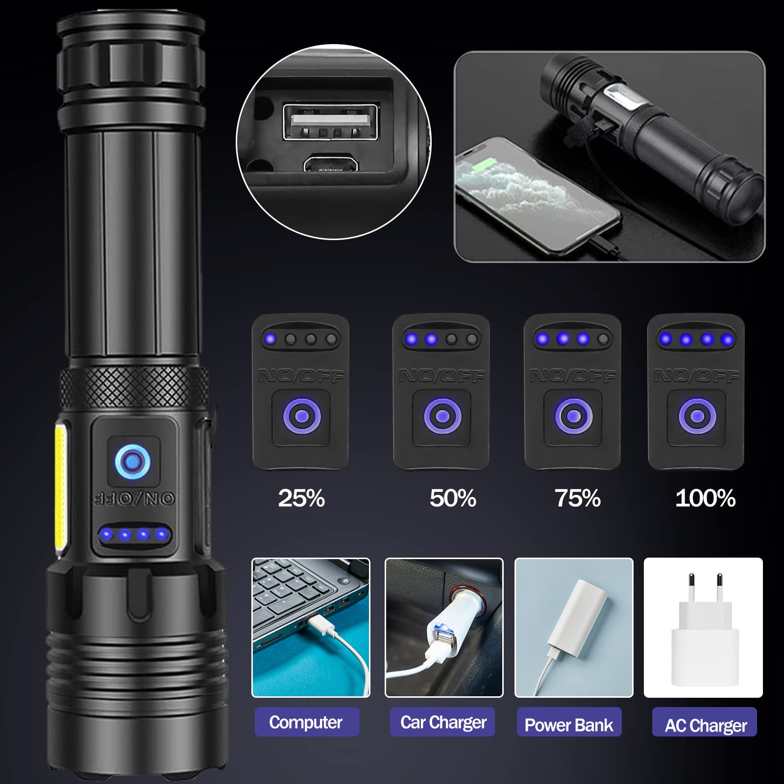 LED Taschenlampe Aufladbar USB Extrem Hell 90000 Lumens XHP160
