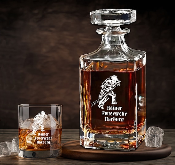 Whisky Set Feuerwehr Gravur Und Wunschtext Karaffe 700 Ml Und Gläser Personalisiert Holzbox Geschenk (Motiv 4: Feuerwehrmann Mit Schlauch, Nur Karaffe
