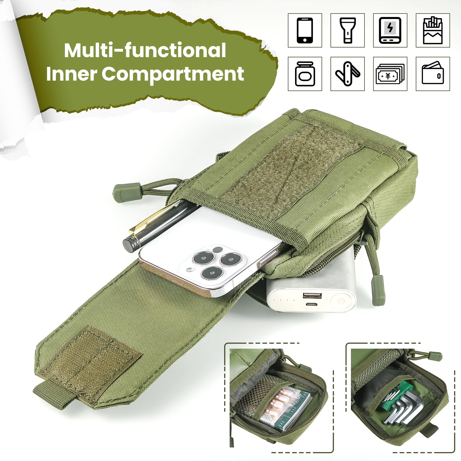 Taktische Handytasche, Handy-Holstertasche, Mehrzweck-Gürteltasche, Gürteltasche mit Handy-Holsterhalter für Workout, Wandern, Camping, Outdoor khaki Kompaktes Design für taktische Tasche: Maße der taktischen Handytasche: 17 x 13 x 6,1 cm, entworfen mit MOLLE-System-Befestigungsriemen. Zwei feste Reißverschlüsse verhindern, dass Gegenstände herausrutschen. Starke Gurtbandschlaufen auf der Rückseite, extrem abriebfest und hochbelastbar. 4 Kartenfächer ermöglichen die Aufbewahrung kleiner Werkzeuge, Ausweis und Kreditkarte, Quittungen oder etwas Bargeld, während du unterwegs bist. Handy Gürteltasche Handytasche Gürtel Universelle Taktische Aree-Handy Beschreibung: Outdoor Taktische Handy Gürteltasche Bauchtasche Armee Hüfttasche Sport HerrenProduktbeschreibung:Die Outdoor Gürteltascheist eine super praktische Tasche, in der Sie Ihre Dinge praktisch verstauen können. Die... Es ist sehr praktisch für den Transport kleiner Gegenstände und Werkzeuge, wie Handy, Karabiner, Taschenmesser, tragbare GPS-Geräte, Ladegerät, Schlüssel, Kreditkarte, Brieftasche, Stift, Zigarettenanzünder, Sonnenbrille und alles, was Sie sonst noch brauchen, leicht zugänglich zu tragen. GARANTIE: Wenn Sie nach dem Kauf Probleme haben, zögern Sie nicht, uns zu kontaktieren, wir garantieren Ihnen eine zufriedenstellende Antwort oder Rückerstattung innerhalb von 24 Stunden. Outdoor Universal EDC MOLLE Gürteltasche perfekt geeignet für Outdoor-Sportaktivitäten Wandern, Angeln, Militär, Jagd, Camping, Reisen, Radfahren und den täglichen Arbeitsplatz. Frontschlaufe für persönlichen Aufnäher. Smartphone Tasche Taktische Molle-Tasche – EDC Utility Gadget Hüfttasche Pack – Camping Wandern Outdoor Ausrüstung – Handyhalter – Schwarz Handy Tasche Gürtel Das klassische, flache Design passt sowohl für Männer als auch für Frauen Hinteres MOLLE-System mit zwei verstellbaren Knöpfen, kann für unterschiedlich breite Gürtel passen und an einen Gürtel gehakt oder mit MOLLE-Gurten befestigt werden. USA-Aufnäher ist ebenfalls im Lieferumfang enthalten. Nützliche Molle-Zubehörteile für dich.