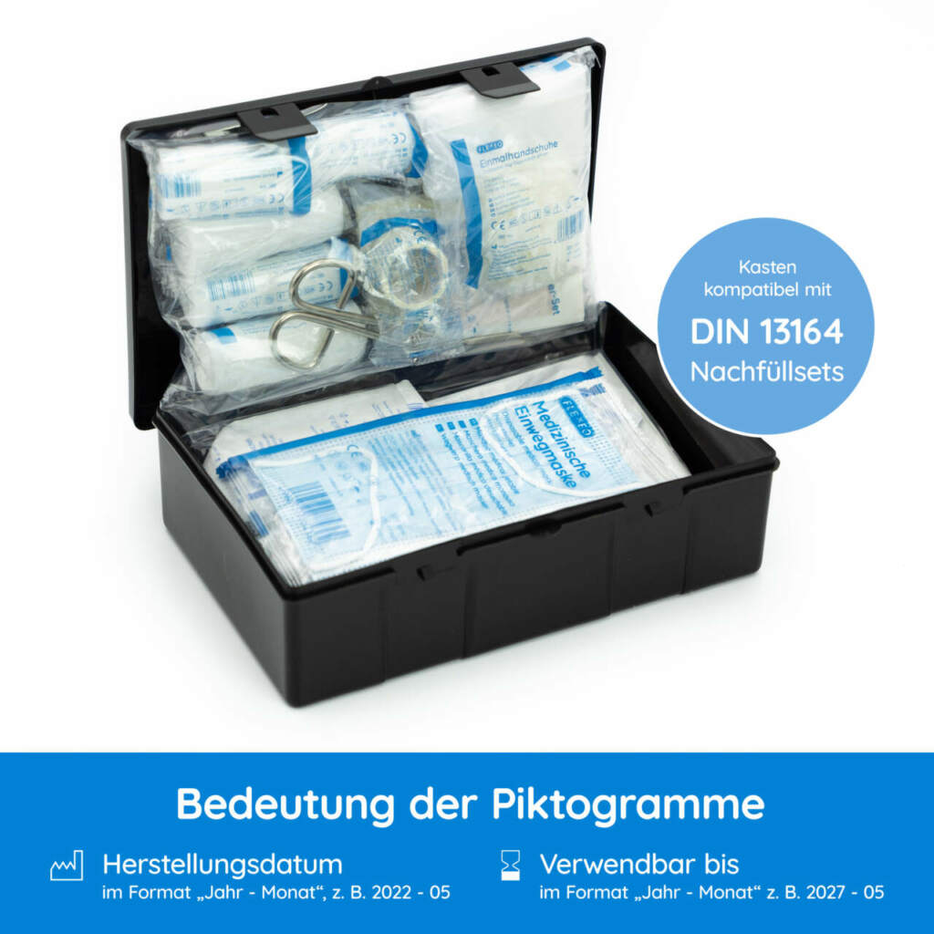 Verbandsmaterial seperat in übersichtlicher Folientasche verpackt Verbandskasten Auto 2025 Tüv Geprüft PETEX KFZ-Verbandkasten DIN 13164:2022 Blau Ab 7,99 Erste Hilfe Set Auto stabiler, bruchsicherer Plastikkasten, Farbe: Schwarz, in Folie verschweißt 2 x Erste Hilfe Kasten Auto mit Verbandsmaterial nach DIN 13164, erfüllt die Anforderung laut StVZo, ebenso gültig in Europa mit Ausnahme von CZ, SK und SI PKW Verbandskasten nach DIN 13164 Ein Verbandkasten ist durch STVZO Pflicht KFZ-Verbandkasten DIN 13164-B - Feuerwehrshop, 12,00 KFZ Auto- Verbandkasten nach DIN 13164, Ultra Medic | Verbandkästen/-Koffer | Erste Hilfe | ARBEITSSCHUTZ | - Shop 2 Masken • perfekte Ordnung für schnellstmögliche Zugriff • ein Verbandkasten ist durch STVZO in jedem Kraftfahrzeug Pflicht • nach DIN 13164 2022-02 bestückte, erfüllt den §35h der STVZO • Achtung: Verbandkästen haben ein Verfal