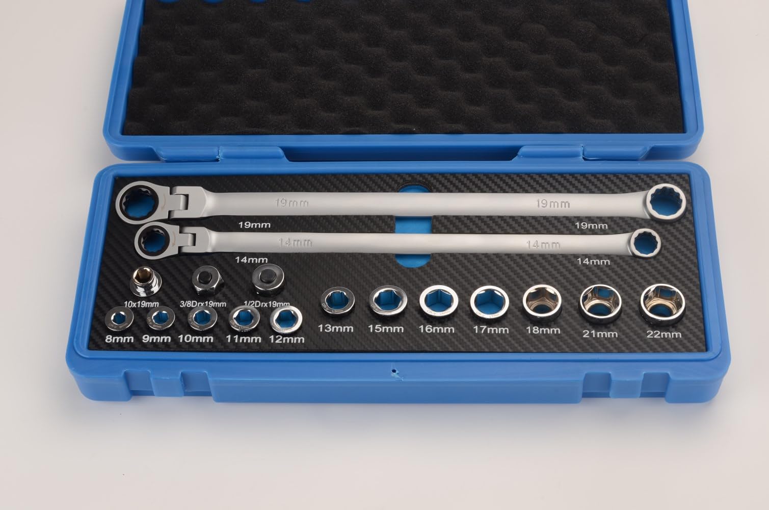 FLZOSPER 17-teiliges Extra Langes Flexkopf-Ratschenschlüssel-Set, 72-Zahn- Verlängerungs-Werkzeugleiste Mit 12 8–22 Mm Ersatzköpfen Und 3 Steckschlüssel-Adaptern, CRV