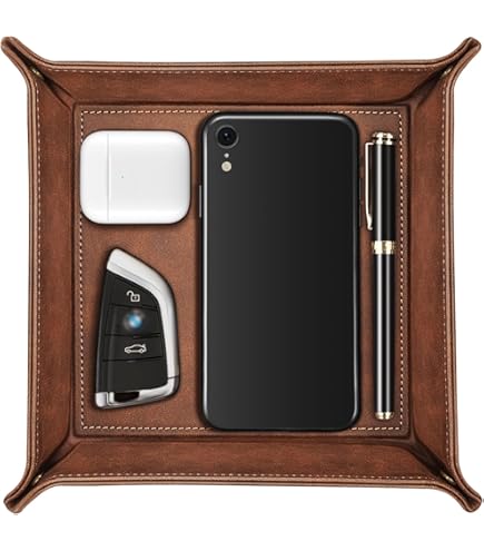 Anwendungen: Das XNONE Ledertablett mit Metall ist perfekt für den Einsatz in Schlafzimmern, Wohnzimmern, Büros und anderen Einrichtungen. Exquisite Verarbeitung: Das XNONE Ledertablett mit Metall ist aus hochwertigem Leder gefertigt und verfügt über eine exquisite Verarbeitung. Auch ein tolles Geschenk ideal für Hochzeiten, Einweihungsfeiern und tägliche Überraschung. Sammeln Sie Ihre Gegenstände an einem Ort mit einem großartigen Helfer für die Organisation zu Hause Vielseitig einsetzbar und gut organisiert: Ein Muss für Handy, Uhr, Schmuck, Fernbedienung, Schlüssel, Schmuck und Münzen oder andere Gegenstände auf dem Schreibtisch, hält Ihre Gegenstände ordentlich und ordentlich. Männer Organizer Büro-Schreibtisch-Organizer - Vlando Leder Schreibtisch-Organizer Caddy Mit Schublade Zur Valet Tray Kratzfest und wasserfest: Dieser Schmucktablett ist aus hochwertigem PU-Leder, wasserdicht, kratzfest, langlebig genug für eine lange Lebensdauer, leicht zu reinigen 【Spezielle Verarbeitung】Das in diesem Tablett verwendete Leder wird mit einem speziellen Verfahren behandelt, um es weich und glatt zu machen. Vielseitig einsetzbar und gut organisiert: Ein Muss für Handy, Uhr, Schmuck, Fernbedienung, Schlüssel, Schmuck und Münzen oder andere Gegenstände auf dem Schreibtisch, hält Ihre Gegenstände ordentlich und ordentlich. Geeignet für Schlafzimmer, Kommode, Badezimmer, Wohnzimmer und Bürotische. Kratzfest und wasserfest 【Weit verbreitet】 Dieses Ledertablett mit Metall eignet sich für den Einsatz in einer Vielzahl von Umgebungen, von Häusern bis hin zu Büros. Kratzfest und wasserfest: Dieser Schmucktablett ist aus hochwertigem PU-Leder gefertigt und mit MDF in der Mitte verstärkt, verfügt über eine exquisite Verarbeitung. Vielseitig verwendbar: Dieses Ledertablett mit Metall eignet sich für den Einsatz in einer Vielzahl von Umgebungen, von Häusern bis hin zu Büros. Eine günstige Wahl in Bezug auf wasserdicht, kratzfest, langlebig genug für eine lange Lebensdauer. Sie müssen nur sanft mit einem feuchten Tuch abwischen, um den Glanz zu erneuern. Ungefähre Maße: 21,5 x 14,7 x 4,8 cm, wodurch es eine perfekte Größe für die Aufbewahrung kleiner Gegenstände hat. Premium Leder Schreibtischorganizer | Ilario | Maxwell Scott Exquisite Verarbeitung: Doppelschichtiges Premium-PU-Leder-Material mit zarter Textur und dezenten Nylon-Nähten, ideal in Form des Tabletts und leicht zu reinigen. Dadurch wird sichergestellt, dass Ihre Gegenstände nicht zerkratzt oder beschädigt werden, wenn sie in das Tablett gelegt werden. Es kann verwendet werden, um Schlüssel und andere kleine Gegenstände in einem Eingangsbereich aufzubewahren oder um Schmuck auf einer Kommode zu organisieren.