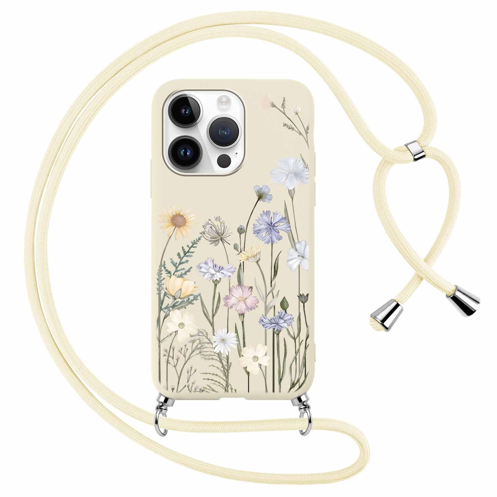 Vxinvnoi Handykette Handyhülle Für IPhone 15 Pro 6,1" Hülle Mit Band, Aesthetic Muster Blumen Case Mit Kordel Zum Umhängen, Weich TPU Bumper Dünn Silikon Stoßfest Schutzhülle Für IPhone 15 Pro, Beige