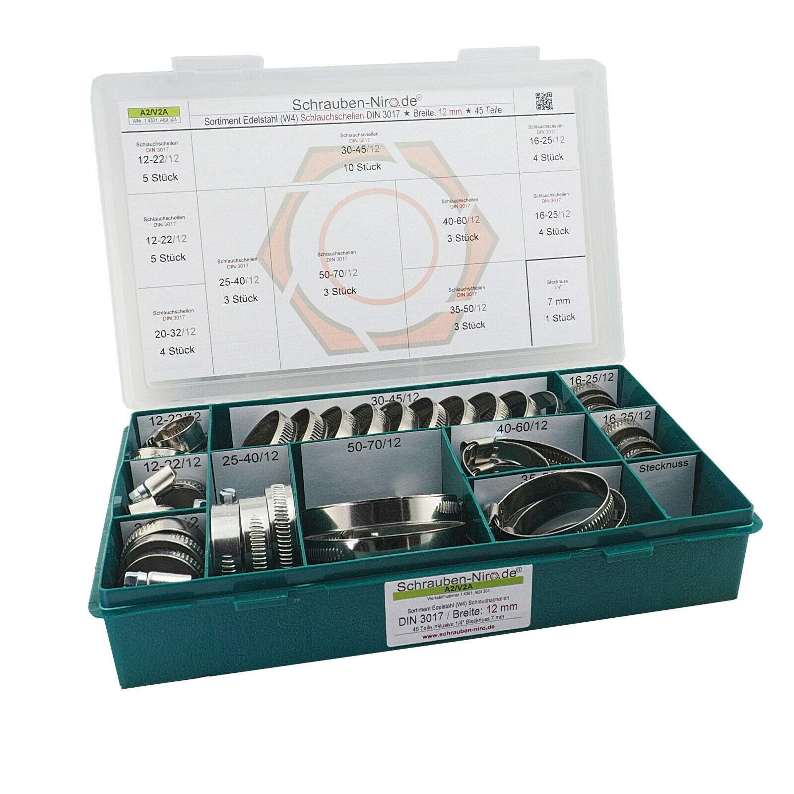 Schlauchschellen, auch Schlauchklemmen oder Binder genannt, werden aus hochwertigem Edelstahl A4 (V4A) hergestellt. Die Fertigung aus diesem Material ermöglicht den Einsatz sowohl in Feuchträumen als auch im Außenbereich 4 st justerbara slangklämmor i rostfritt stål för att säkra flexibla Schlauchschellen Edelstahl Groß Schneckengewinde Schlauchschellen W4 Rostfreier Edelstahl Bandbreite Schlauchschellen Din 3017 SCHLAUCHSCHELLEN SET MIT 40 - 60 MM SPANN-BEREICH] Das Schellenset kann zur Reparatur von Wasser Anschluss von z.B. Spülmaschine, Waschmaschine oder Teichpumpe verwendet werden