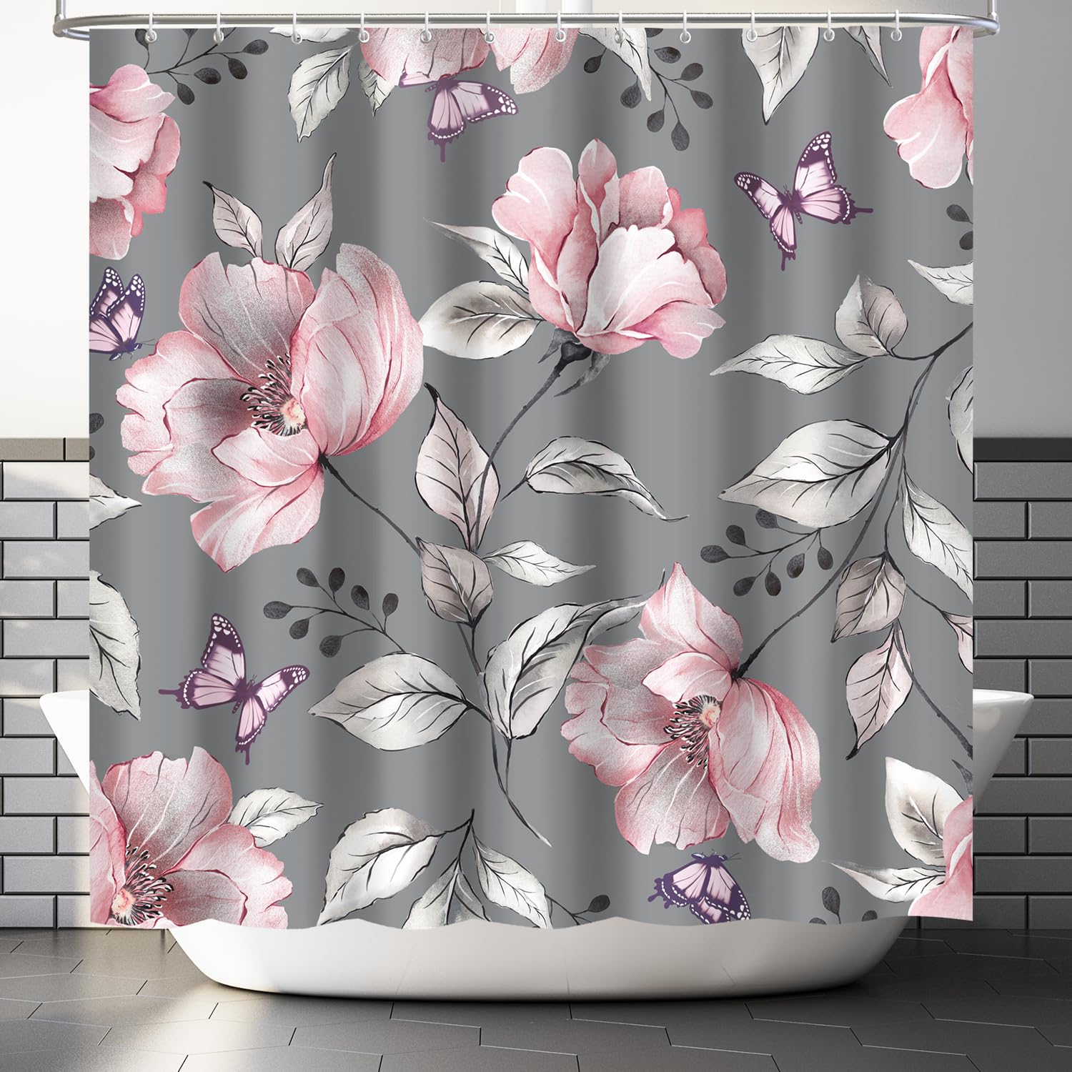 WEENEO Boho Duschvorhang-Set Mit Blumenmuster, Blau, Rosa, Grau