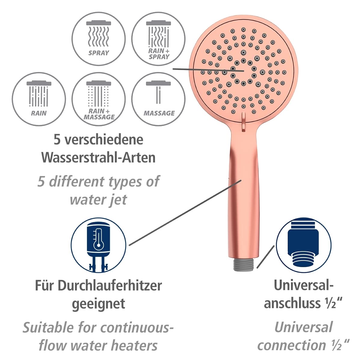 Das innovative Duschkopf-Sortiment von WENKO überzeugt durch Funktionalität, Design und Qualität. Die innovativen Produkte verfolgen stets Die bessere Idee und zeugen von Erfindergeist und eindrucksvollem Design. WENKO Duschkopf Young Weiß Ø 11 cm - innovative Duschbrause mit 5 wohltuenden Wasserstrahlarten Mit der hochwertigen Universal-Handbrause im ergreifend schönen Weiß verwandeln Sie Ihr Bad im Handumdrehen in eine Wellness-Oase. Dieses Streben hat uns europaweit zum führenden Anbieter innovativer Produktlösungen gemacht., Mehr als 1., 000 angemeldete Patente und zahlreiche Auszeichnungen, für Produkte und auch für die Marke selbst, sprechen dabei für sich. Das belegen zahlreiche Produkt- und Unternehmens-Awards. Spa-Feeling: Neben der Regenstrahl-Funktion, die Sie wie ein sanfter, angenehmer Tropenschauer entspannt, verfügt dieser Brausekopf noch über 4 weitere Wasserstrahl-Arten (Rain&Massage, Massage, Spray, Rain&Spray) und garantiert so Ihr persönliches Wellness-Programm Einer für alle: Die komfortable Duschbrause verfügt über einen Universalanschluss mit ½“ und ist natürlich auch für Durchlauferhitzer geeignet Grohe Duschkopf WENKO Duschkopf Mod. Basic Chrom, Universal-Handbrause, Praktische Duschbrause Mit 2 Strahlarten & Komfortabler Drucktastenumstellung, Einfache Kalkreinigung, Kunststoff, 15 Cm Duschkopf Mit Schlauch Ein hohes Maß an Kundenzufriedenheit und ein faires Preis-Leistungs-Verhältnis spielen dabei eine zentrale Rolle. Ein sanfter, angenehmer Tropenschauer entspannt Sie beim Duschen. Vom klassischen Wandhaken bis hin zum mobilen Kleiderschrank finden Sie bei WENKO nicht nur gute, sondern bessere Ideen - unser stetiger Anspruch und gelebtes Motto. Daher setzen wir auf die Verwendung von hochwertigen und nachhaltigen Materialien wie zum Beispiel Holz aus FSC-zertifizierten Wäldern oder auf wiederverwertetes Verpackungsmaterial. Denn neben der Regenstrahl-Funktion, die wie ein sanfter, angenehmer Tropenschauer entspannt, können Sie noch zwischen vier weiteren Strahlarten wählen: Genießen Sie die belebende Massage- oder die spritzige Sprühfunktion sowie Kombinationen aus verschiedenen Strahl-Arten in Ihrer bevorzugten Wasserstrahlstärke. Denn WENKO ist Ihr Experte für nützliche Helfer im Haushalt, trendige Badaccessoires und clevere Ordnungssysteme für die Küche. So schön können Duschköpfe sein Das innovative Duschkopf-Sortiment von WENKO überzeugt durch Funktionalität, Design und Qualität. Und das ist nur eine Funktion, die die clevere Handbrause zu bieten hat. Auch wir sind uns unserer Verantwortung für die Umwelt, Ressourcen und die Gesellschaft bewusst und haben die Optimierung hinsichtlich nachhaltigem Handeln fest in unseren Geschäftsprozess integriert. Mit der neuen Trendserie - die Duschkopflinie Young - von WENKO gibt es nun Brauseköpfe, die in angesagten Farben und Formen daherkommen und ein hervorragendes Preis-Leistungsverhältnis bieten. Universal-Genie für alle Die komfortable Duschbrause verfügt über einen Universalanschluss mit ½“ und ist natürlich auch für Durchlauferhitzer geeignet. Das verleiht dem Badezimmer ein stilvolles Interior-Design Der WENKO Duschkopf Young Weiß ist eine langlebige Universal-Handbrause mit trendigen 5 Strahlarten Die praktischen Noppen sorgen für eine einfache Kalkreinigung und garantieren eine lange Nutzungsdauer Neben der Regenstrahl-Funktion verfügt der Duschkopf über 4 weitere Wasserstrahl-Arten (Rain&Massage, Massage, Spray, Rain&Spray) und bietet somit ein persönliches Wellness-Programm Der Duschkopf ist für alle geeignet und verfügt über einen Universalanschluss mit ½“ Das moderne Design in puristischem Weiß verleiht dem Badezimmer ein stilvolles Interior-Design Der formschöne Brausekopf ist aus stabilem Kunststoff (ABS) gefertigt und hat einen Durchmesser von 11 cm Die separate, innenliegende Wasserführung wurde nach KTW und W270 Leitlinie produziert. Mit der hochwertigen Universal-Handbrause im ergreifend schönen Weiß verwandeln Sie Ihr Bad im Handumdrehen in eine Wellness-Oase. Gönnen Sie sich den Luxus einer Regendusche mit dem trendigen Duschkopf Young im puristischen Weiß WENKO übernimmt Verantwortung In der heutigen Zeit sind Nachhaltigkeit und Umweltbewusstsein zentrales Thema. WENKO, das sind Produkte rund um Bad, Küche, Wäsche und Wohnen. Verwandeln Sie im Handumdrehen Ihr Badezimmer in eine Wellness-Oase mit Spa-Feeling! Der angesagte Brausekopf (Ø 11 cm) ist aus stabilem ABS gefertigt und im ergreifend schönen Weiß gehalten. Langlebige Produkte, die aus verantwortungsvollen Quellen stammen und unter fairen Arbeitsbedingungen produziert werden sind unser Bestreben. Genießen Sie Ihr persönliches Spa-Erlebnis zuhause! Dabei ist der hochwertige Duschkopf aus stabilem ABS mit praktischen Noppen ausgestattet, die für eine einfache Kalkreinigung sorgen und so eine langlebige Nutzungsdauer garantieren. Eventuelle Kalkablagerungen an den Düsen können einfach mit den Fingern abgerieben werden Innovation Bei WENKO finden Sie nicht nur gute, sondern bessere Ideen! Das verleiht dem Badezimmer ein stilvolles Interior-Design. WENKO Young Line Duschkopf schw, Durchmesser 110-5 Duschköpfe