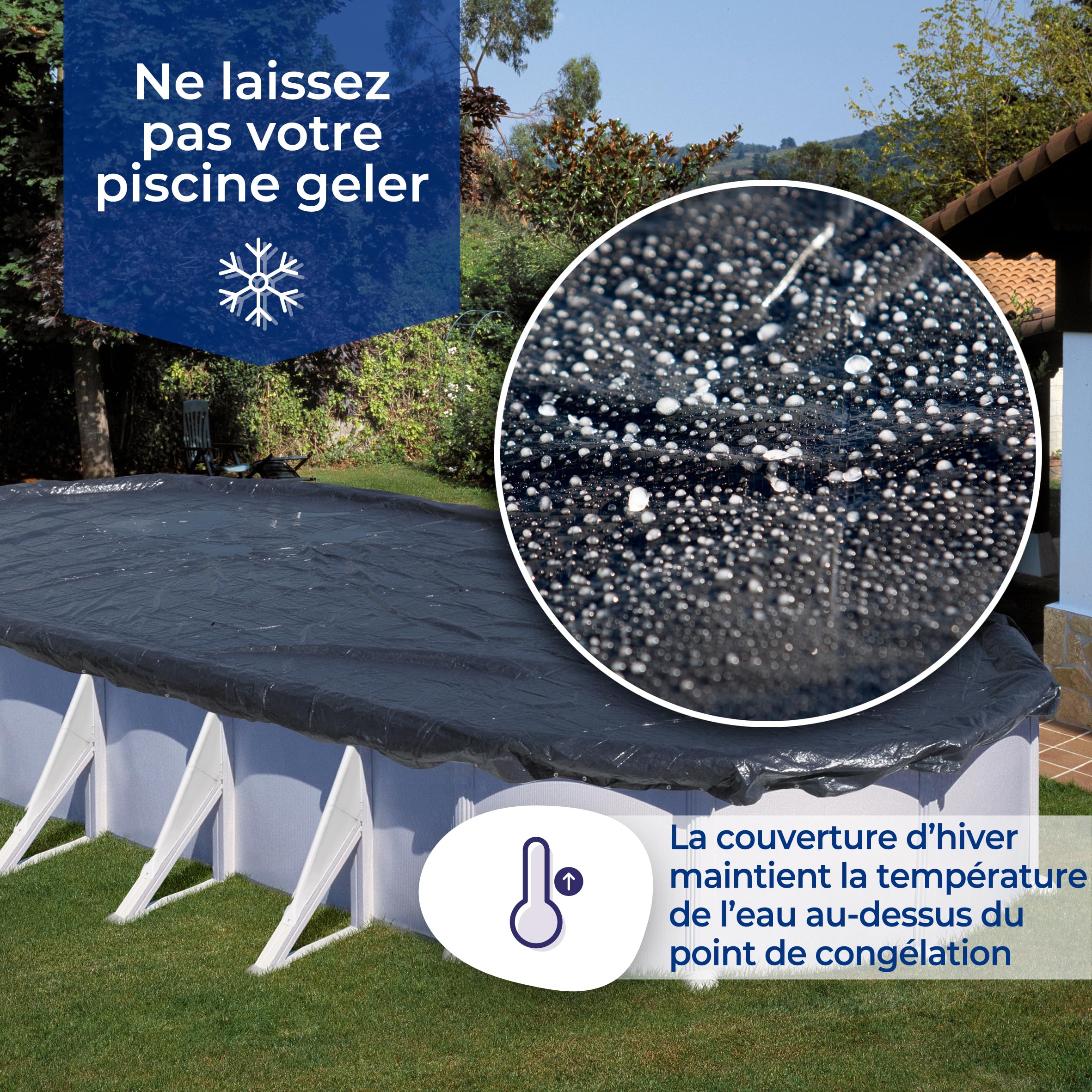 Intelligentes Sparen beginnt mit einer Poolabdeckung Schutz, Wirkungsgrad, Seelenfrieden Verhindert das Einfrieren: hilft, die Wassertemperatur über dem Gefrierpunkt zu halten Eine Winterabdeckung schützt den Pool vor Schmutz und erleichtert die Inbetriebnahme zu Beginn des Sommers. Gleichzeitig schützen sie vor das Hineinfallen. Hergestellt aus Polyethylen und mit einer verbesserten Dicke von 120 g/m2, die eine höhere Qualität und Haltbarkeit garantiert, mit einem zentralen Loch, um zu verhindern, dass chemische Konzentrationen die Abdeckung beschädigen Hohe Anpassung Um die best möglichste Einstellung sicherzustellen, braucht die Abdeckplane ein Stahl-Kunststoff-Kabel und einen verstellbaren Spanner mit Ablauf im mittleren Bereich, um die Konzentration von Chemikalien zu vermeiden. Poolzubehör - günstig kaufen bei (3 Poolkissen Rund 4m WINTERABDECKUNG Für Rundpool 550 Cm Pool Haube Abdeckplane Winterabdeckung Rundbecken 3,50 – 3,60 m – Pumpen GmbH Verabschiede dich vor Algen Dank ihrer schwarzen Farbe verhindern die Gre-Winterabdeckplanen, dass das Sonnenlicht eindringt, was die Verbreitung von Algen entgegengewirkt. Der Schutz des Schwimmbeckens während des Winters erleichtert die Inbetriebnahme zu Beginn der Saison, da weniger Chemikalien eingesetzt werden müssen. Wassereinsparung: Die Verwendung einer Winterabdeckung außerhalb der Badesaison reduziert die Wasserverdunstung um bis zu 95Prozent. Weniger Chemikalien: Schützt das Schwimmbecken während des Winters, hält das Wasser in gutem Zustand und verhindert das Algenwachstum, wodurch der Gebrauch von chemischen Produkten reduziert wird Darüber wird die Einrichtung einfacher Bei Gre sorgen wir für eine nachhaltigere Welt! Die Gre Winterabdeckplane hat einen Durchmesser von 640 cm und ist somit für Rundbecken mit einem Durchmesser von 550 cm geeignet.