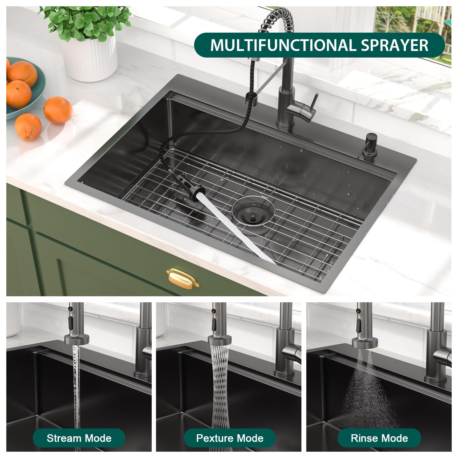 Seine Tiefe reduziert Spritzer, vereinfacht das Waschen und unterstützt Multitasking mit Leichtigkeit. Die schlanke Topmount-Kante passt bündig zu Ihrer Oberfläche, während die abgerundeten R10-Ecken für eine einfachere Reinigung und ein modernes Aussehen sorgen. KELINGOUD Schwarz Küchenspüle Wasserfall it Wasserhahn Ausziehbar, 1... Die Korrosionsschutzoberfläche und die robuste Struktur sorgen für lang anhaltende Schönheit und zuverlässige Leistung in stark frequentierten Küchen Dieser multifunktionale Arbeitsplatz enthält ein Edelstahlsieb, ein Schneidebrett aus Massivholz, ein aufrollbares Trockengestell, ein schützendes Bodengitter und einen hochbogenförmigen ausziehbaren Wasserhahn – bietet ultimativen Komfort und Effizienz für Ihre Küchenroutinen Egal, ob Sie Ihr Zuhause umbauen, eine Miete aufwerten oder sich auf große Familienfeiern vorbereiten, diese Aufsatzspüle bringt sowohl Funktion als auch Stil in Ihre tägliche Küchenroutine. Sein integriertes Arbeitsplatzzubehör, einschließlich ausziehbarer Armatur, Sieb, Schneidebrett und Rollregal, verwandelt diese Spüle in eine wahre kulinarische Kommandozentrale. Diese Einbauspüle mit Außenmaßen von 71,1 cm B x 55,9 cm T x 22,9 cm H und Innenmaßen von 66 cm B x 41 cm T x 22 cm H. Alle Produkte und Zubehörteile von Talllor werden innerhalb von 2 Jahren mit einem 1-jährigen Ersatz und Zubehörersatz geliefert Wir bieten exzellenten Kundensupport. Das Paket enthält die 71,1 x 55,9 cm große schwarze Küchenspüle, ein Edelstahlsieb, ein Schneidebrett aus Massivholz, ein aufrollbares Trockengestell, ein schützendes Bodengitter, Ablaufmontage, Installationsset, Schranköffnungspapier und einen hochbogenförmigen ausziehbaren Wasserhahn. Edelstahl Küchenspüle Einbauspüle Spülbecken mit Abflusskorb Küchenarmatur 40x45 Diese schwarze Küchenspüle bietet hervorragende Haltbarkeit gegen Kratzer, Flecken und täglichen Verschleiß. Wasserfall-Küchenspüle 59.94cm*45.72cm, Einzelbecken-Einbauküchenspüle Aus Edelstahl 304 Mit Ausziehbarem Wasserhahn Und Mehreren Zubehörteilen Die 71,1 cm große Küchenspüle mit Facuet-Kombination ist aus 16-Gauge-Premium-304-Edelstahl mit einem mattschwarzen Finish gefertigt.
