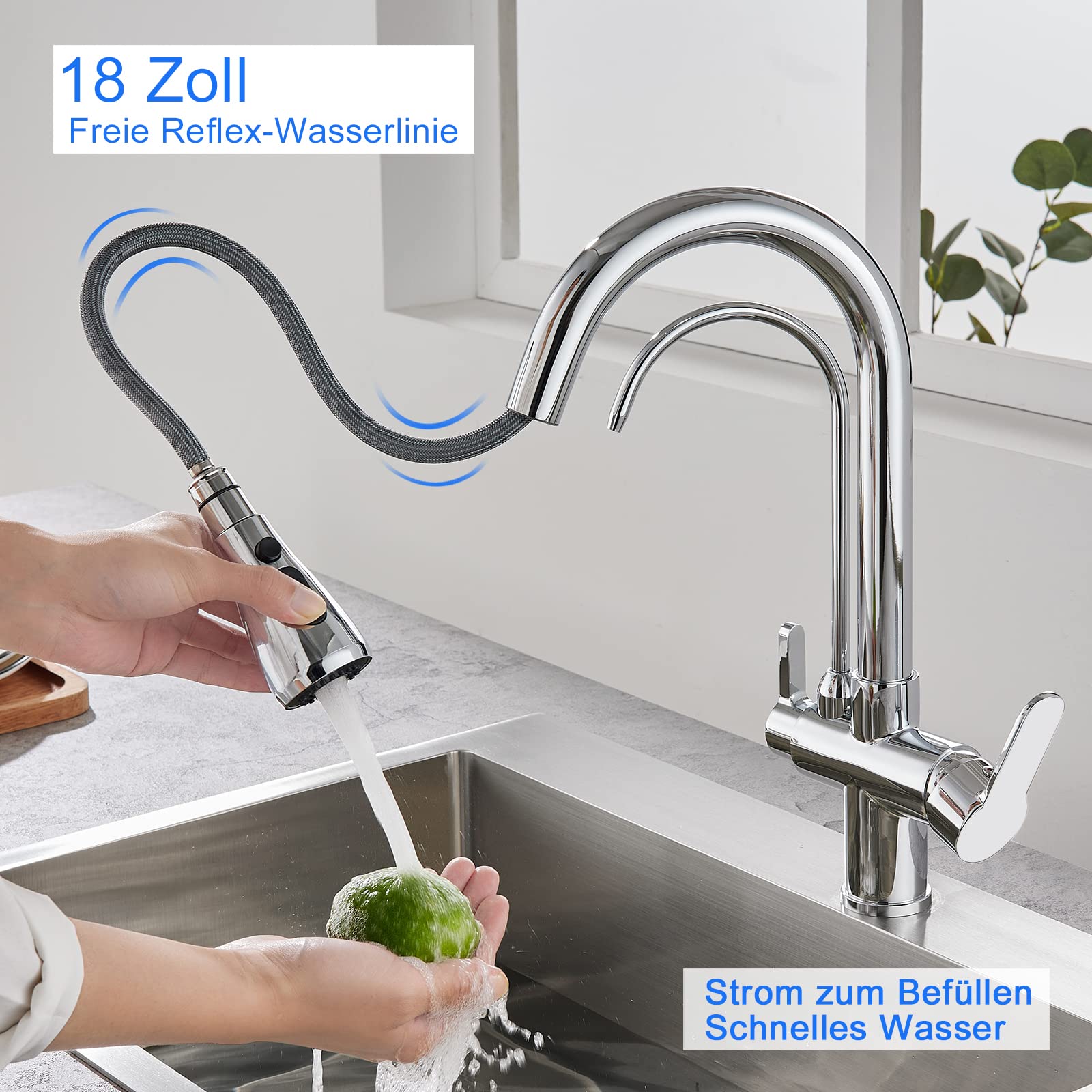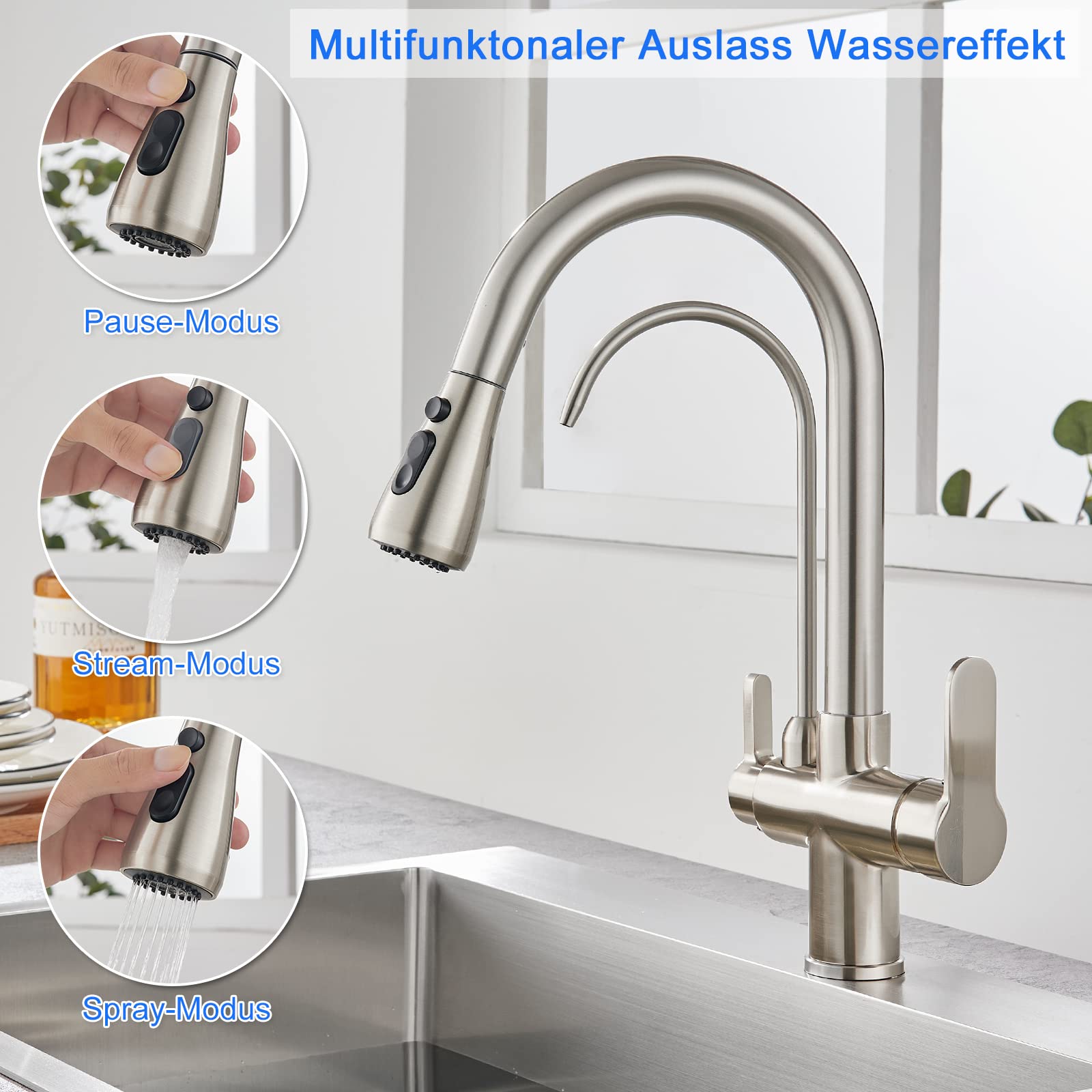 Wenn Sie die Funktion des Trinkwassers nicht benötigen, kann es als ausziehbare Küchenarmatur für Ihre Bequemlichkeit behandelt werden. Moderne Küchenarmaturen können oftmals mehr als nur warmes und kaltes Wasser spenden. Manche Modelle versorgen mit kochendem Wasser, können als Aufsprudler für Trinkwasser genutzt werden oder sind aufgrund ihres außergewöhnlichen Designs gleichzeitig ein Dekoelement 【Einzigartig gestalteter Wassermodus】 Wir haben das Design von Trinkwasser mit dem von ausziehbaren Küchenarmaturen kombiniert, daher können Sie Ihre Kosten für den Kauf eines Trinkwasserhahns oder einer ausziehbaren Küchenarmatur sparen., Vier Funktions-Wassermodi: 1., Trinkwasser; 2., Durchflussmenge: 1,8 GPM; 3., Sprühen; 4., Pause WILGOON Küchenarmatur Mischbatterie 360° Drehung- Wasserhahn Küche Ausziehbarer Sprühstab: 61 cm flexible Schlauchreichweite für einfache Nutzung. Raffinierte Details: Der unabhängige Schalter macht das Ein- und Ausschalten bequem ohne die Berührung des Griffs. Wasserfilter Wasserhahn Küche Küchenarmatur 3 Wege Wasserhahn Mit Osmoseanlage Wasserfilter Osmose Wasserhahn Die Profilgröße für den Zulaufschlauch beträgt 9/16 Zoll. Gib deiner Küche das gewisse Etwas mit unseren stilvollen und funktionalen Wasserhähnen! Entdecke eine Vielzahl von Küchenarmaturen jetzt bei