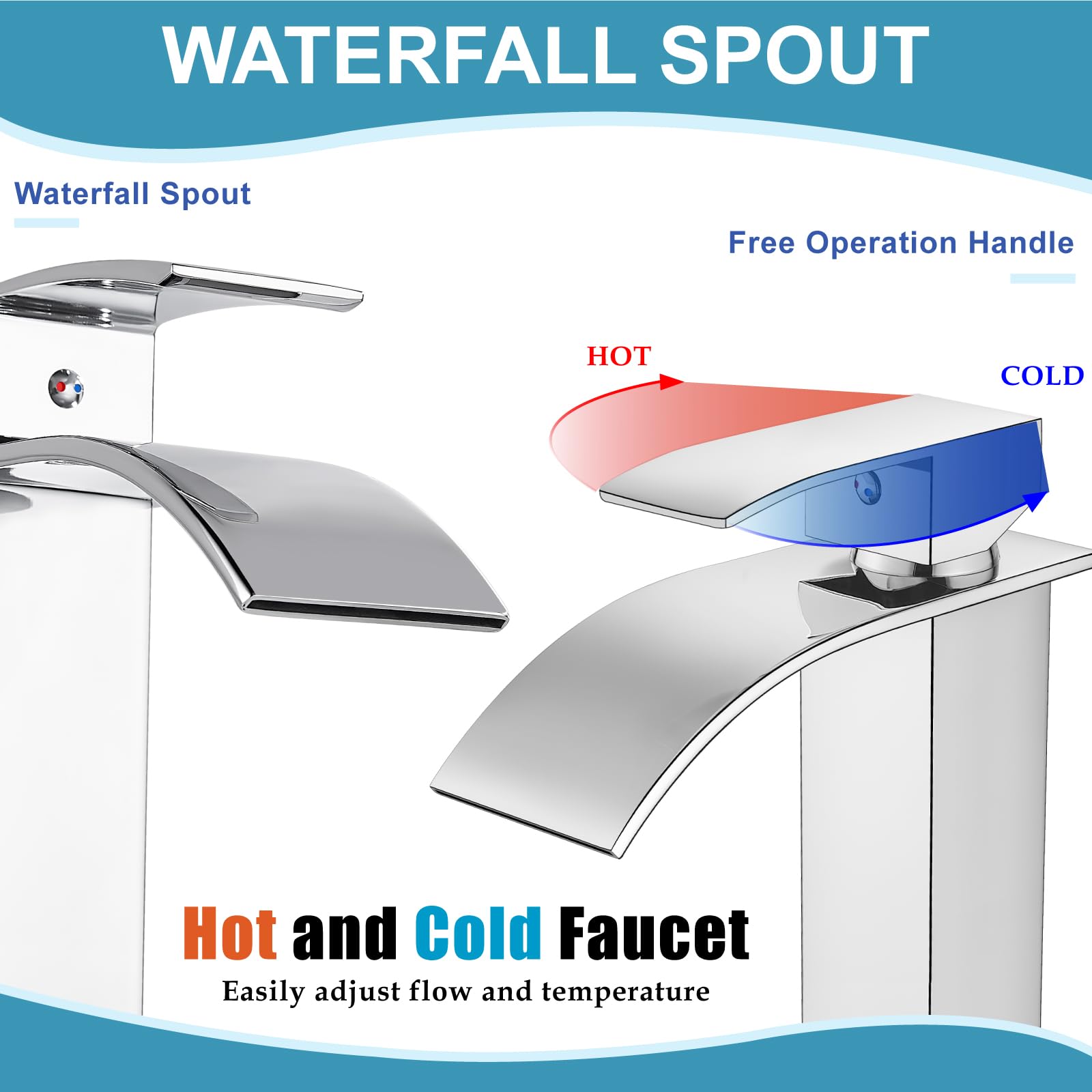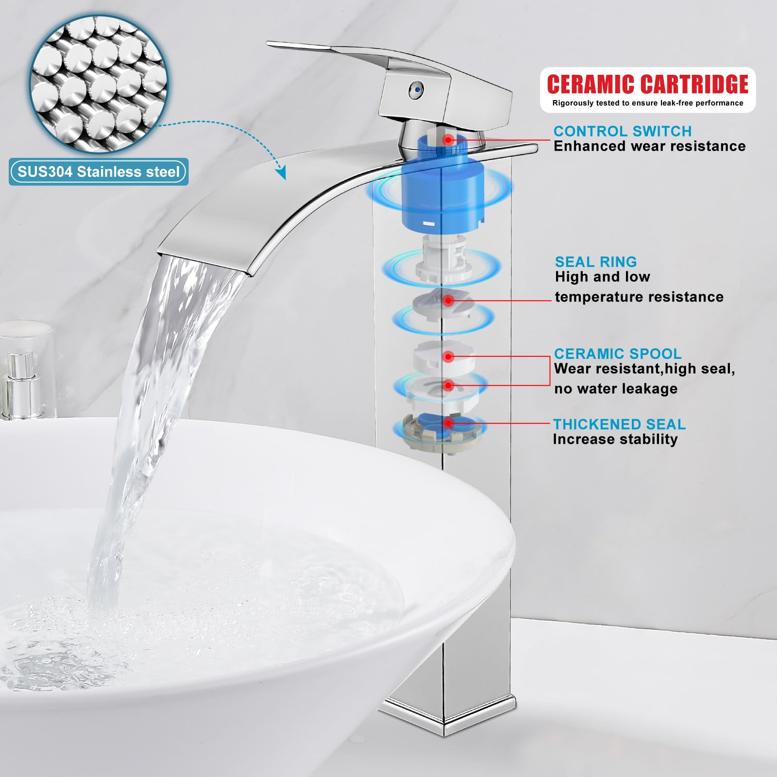 Mit einem Paar 61 cm langen Standard-Wasserleitungen mit 3/8-Zoll-Innengewinde x M10-Stecker. Produktbeschreibung: Der Midanya Wasserhahn wurde sorgfältig entwickelt und bietet hervorragende Leistung. 【Besonderheiten】Einhand-Design für kraftvollen Wasserstrahl und bequeme Temperaturregelung. Modernes Design: Die verchromte Oberfläche der Waschbeckenarmatur ist pflegeleicht und langlebig und sorgt für einen lang anhaltenden Glanz. Der besondere Spiegeleffekt passt perfekt zu jeder Einrichtung im Bad Wasserhahn Bad Wasserfall Hoch Waschtischarmatur Chrom Waschbecken Der Wasserhahn ist geeignet für Gefäßspüle mit 1 Loch. 【Einfache Installation】: Die Installationslochgröße dieses Badezimmer-Wasserhahns 1 Loch kann für das Waschbecken mit einem Lochdurchmesser zwischen 3,2 cm bis 3,98 cm verwendet werden. Details des Wasserhahns: Material des Wasserhahnkörpers: SUS304 Edelstahl, Oberfläche: poliertes Chrom, Anzahl der Griffe: Einzelgriff, Montagelöcher: ein Loch. Bitte beachten Sie, dass der Ablauf nicht im Lieferumfang enthalten ist. Material: Dieser Badezimmer-Wasserhahn ist aus SUS304 Edelstahl gefertigt, robust und strapazierfähig mit großem Druck., Maximale Durchflussmenge: 1,19 GPM., 4,5 l/min Der Badarmatur bietet einen klaren und gleichmäßigen Laminarstrahl. Fandaucy Glas-Auslauf Wasserhahn Waschbeckenarmatur Mit Wasserfall
