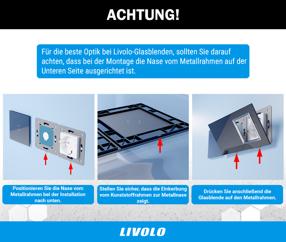 Im Dunkeln lassen sich die Schalter einfach finden. Allgemeine Beschreibung: Glas Touch Lichtschalter der Marke LIVOLO für UnterputzOptional mit GlasrahmenStellen Sie sich Ihre eigenen Lichtschalter,Steckdosen, USB-Dosen, etc nach Bedarf zusammen. Wechselschalter Lichtschalter mit Steckdose VL C7 K1S/C1EU 11 A Weiß LIVOLO | Weiß | Mechanischeschalter | LIVOLO | Produkte | Luxus Time Shop Passend für die üblichen Unterputzdosen mit einem Durchmesser von 60mm mit Schraubgewinde. Design Glasrahmen mit Touchsystem Livolo Glasblende für vier Touch Schalter und ein Modul VL C7 C1 C1 C1 C1 SR 12 A Netzshopping: Entdecken Sie mühelos Shopping-Angebote auf Netzshopping. Oben unter Varianten finden Sie die einzelnen Module und Glasrahmen. Steckdose Schwarz LIVOLO Glas Touch Lichtschalter Funkschalter Steckdosen Wechselschalter Uvm In Weiß (Modul: Blende VL-K0-11 Smart Lichtschalter Achtung bei Leuchten unter 20 Watt: In dem Fall ist ein Widerstandsadapter für die Lichtschalter erforderlich. Diesen finden Sie ebenfalls hier. Diese Lichtschalterserie vereint elegantes Design mit modernster SensortechnikDie Oberfläche besteht aus Sicherheitsglas dahinter befindet sich ein Aluminiumrahmen in schwarz, mit polierten Kanten. Technische Daten:Betriebsspannung: AC110 ~ 250V, 50Hz60Hzmax. Das jeweilige Produkt ist nach Auswahl jeweils auf dem ersten Bild zu sehen. Die Steckdosen sowie alle Lichtschalter sind für die normalen Unterputzdosen mit einem Durchmesser von 60 mm geeignet. Modernes Schalterprogramm von Livolo: Glas-Lichtschalter, Steckdosen & Smart-Home-Steuerung. Hochwertig, berührungslos, stilvoll. Jetzt entdecken! Livolo Design Glas-Lichtschalter und Steckdosen, sowie...Die häufigsten Fragen zu unserem Unternehmen, unseren...Finden Sie hier unsere aktuell reduzierten Artikel. Schauen...Kontakt Um uns eine Nachricht zu schicken, füllen Sie...Erleben Sie eine Auswahl an Kundenfotos, um unsere... Stromzufuhr für jeden Gang 2., 5max. Passend für die üblichen Unterputzdosen mit einem Durchmesser von 60mm, mit Schraubgewinde. Die Kontur der Berührungsfläche ist dezent beleuchtet, wodurch eine einfache Bedienung zu jeder Tageszeit möglich ist.