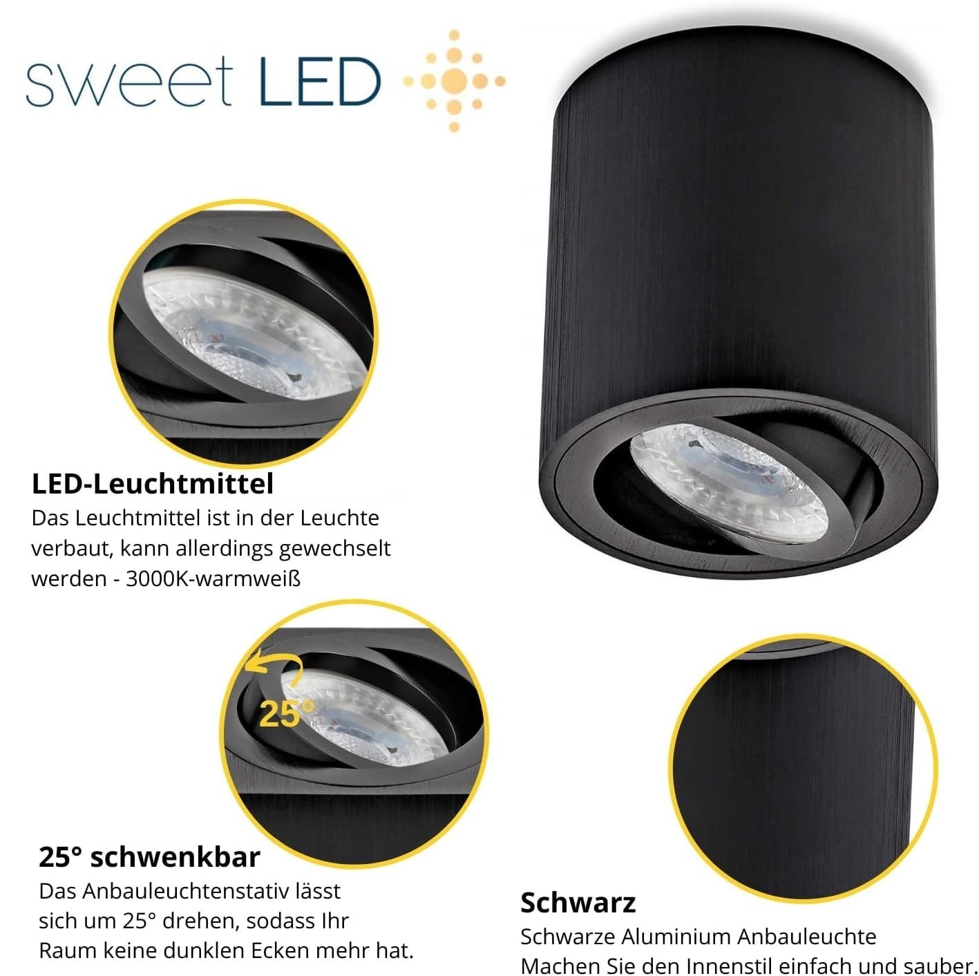Hinzu kommt der 2-in-1 Mechanismus. Deckenspots Aufputz CORI Smart Aufbauspot Weiß Silber & Schwenkbar Mit LED GU10 Dimmbar Aufbauspot Schwarz LED Aufbauspots GU10 - LED Beleuchtung: Birnen, Einbaustrahler Material: ALUMINIUM · Einbauöffnung: 179mm x 125mm · Aluminium Aufbauspot für GU10 50mm LED Lampen, GU10 4W LED LAMPE inkl. · Farbe: WEISS · Schwenkbar Aluminium Aufbauspot für GU10 50mm LED Lampen, GU10 4W LED LAMPE inkl., Farbe: WEISS , Schwenkbar: Ja Es ergeben sich dadurch auch viele neue Einsatzmöglichkeiten wie z.B. Einbauöffnung: 179mm x 125mm Bei ausreichendem WLAN Empfang (2,4 Ghz) lässt sich die Spot Deckenlampe im Nu über die Smartphone App „Smart Life – Smart Living“ koppeln und steuern. Hinzu kommt, dass sich das Leuchtmittel ganz einfach auswechseln lässt - keine festverbauten LEDs dank GU10 Lampensockel! Entdecken Sie unsere hochwertige weiße Aufbauleuchte - ein schwenkbarer LED Deckenspot mit einem eleganten runden Design (85x115mm). Perfekt für moderne Innenräume, bietet dieser Aufbaustrahler stilvolle Beleuchtungslösungen für Ihr Zuhause oder Büro Das alles gelingt Ihnen auch mit weiteren Produkten aus unserer Smarthome Produktreihe "EYLA". eine Montage an Decke oder Wand. Dadurch können Sie mit dem Strahler gezielt Bereiche im Wohnzimmer, Arbeitszimmer oder in der Küche anstrahlen.