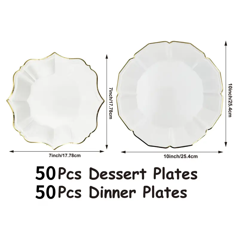 Weiße Und Goldene Pappteller, 50 X 9 Zoll Abendessensteller Und 50 X 7