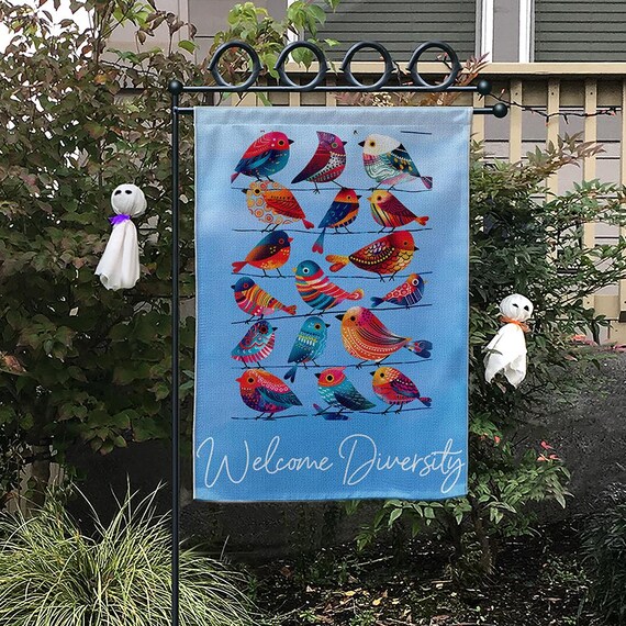 Willkommen Vielfalt Garten Flagge • Bunte Vögel Hof Dekor