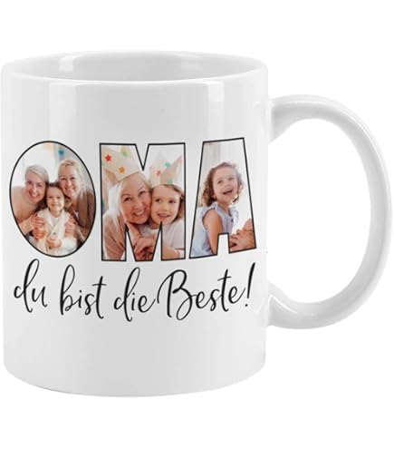 (Ihre Fotos werden in das schöne Design integriert) Die robuste weiße Keramiktasse wird dabei mittels langlebigem Sublimationsdruckverfahren bedruckt, wodurch das Motiv auch mehrere Spülmaschinendurchgänge problemlos übersteht (nach BS EN 12875-4 getestet auf 2., 000 Spülmaschinengänge). Kissen allerbeste Oma Herz | jetzt günstig kaufen Küchen- und Haushaltsartikel online - Tassendruck Fototasse mit Spruch - Allerbeste Oma - zum Selbst gestalten mit Foto-Collage für 3 Fotos, Innen & Henkel Hellblau, 300 ml. Tassendruck Fototasse mit Spruch - Allerbeste Oma - zum Selbst gestalten mit Foto-Collage für 3 Fotos, Innen & Henkel Hellblau, 300 ml Oma Geschenk Weihnachten Tassendruck Photo Mug With Saying "Bester Papa" - To Design Yourself With Photo Tasse Mit Foto Glänzend bedruckter Kaffeebecher mit persönlichen Erinnerungsfotos für alle Lieblingsmenschen in Deiner Familie - eine schöne Geschenkidee zum Geburtstag, zu Weihnachten, zum Muttertag, zum Vatertag oder Valentinstag - dieses Geschenk passt zu jedem Anlass Die Tasse ist spülmaschinenfest (für mehr als 2000 Spülungen) und mikrowellengeeignet - Höhe: 9,5 cm - Ø 8 cm - Gewicht: 350g - Füllmenge 300 ml - Durch den Rundumdruck ist diese Tasse sowohl für Linkshänder als auch für Rechtshänder geeignet , KINDERLEICHTE GESTALTUNG: 1., Auf -Jetzt anpassen- klicken 2., Nacheinander die gewünschten Fotos hochladen 3., Ab in den Einkaufswagen! Dank der Zertifizierung BS EN 15284:2007 ist der Artikel auch für die Mikrowellennutzung geeignet. Hochwertiger Qualitätsdruck von Tassendruck - Made in Germany - seit über 20 Jahren ihr Spezialist für bedruckte Trinkgefäße - viele weitere witzige und süße Motiv-Tassen zu jeder Gelegenheit finden Sie bei uns im Amazon Shop Persönliches Fotogeschenk liebevoll selbstgestaltet - eine hochwertige Keramiktasse bedruckt mit eigenen Fotos für Oma, um Danke zu sagen Alle 3 Fotos werden jeweils in einen Buchstaben gesetzt und ergeben so das Wort Oma. Darunter steht noch in schwarzer Schrift Du bist die Beste. Die Fototasse ist eine wundervolle Geschenkidee für die Oma zum Muttertag, zum Geburtstag oder zu Weihnachten. So kann sie sich immer an ihren Enkelkindern und der Familie erfreuen Tassendruck Fototasse mit Spruch - Allerbeste Uroma - zum Selbst gestalten mit Foto-Collage für 3 Fotos, Innen & Henkel Rosa, 300 ml