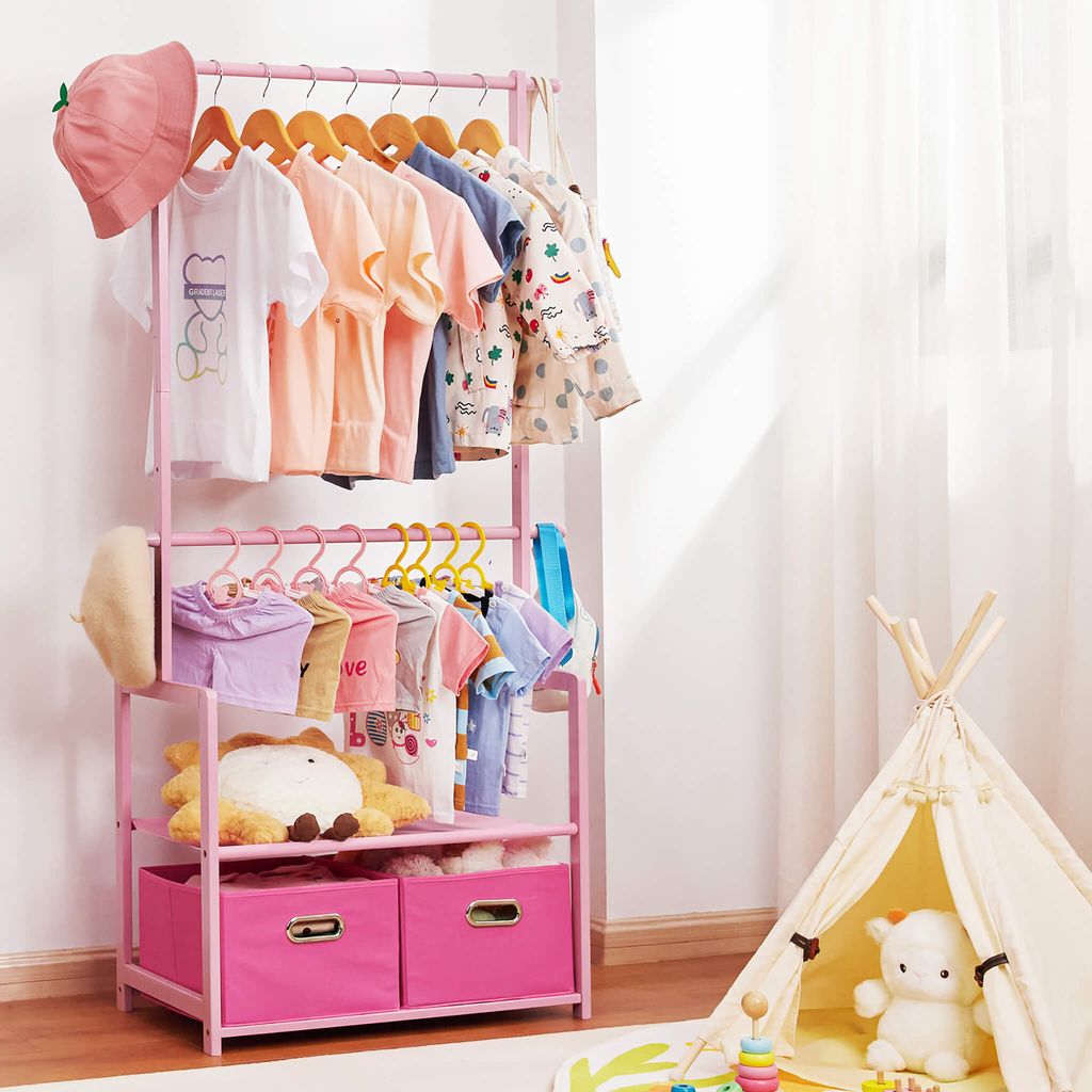 Yorbay Kinder Bambus Kleiderständer Mit 2 Aufbewahrungskörben Und 2 Verstellbaren Hängestangen, Kinder Garderobenständer Für Kostüme Im Kinderzimmer Mit Regal, Anziehständer Für Spielzimmer(Rosa