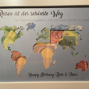 Personalisiertes Geldgeschenk Weltkarte Zum Geburtstag Für Reiselustige Optional Mit Weißem Rahmen 21x30 Cm