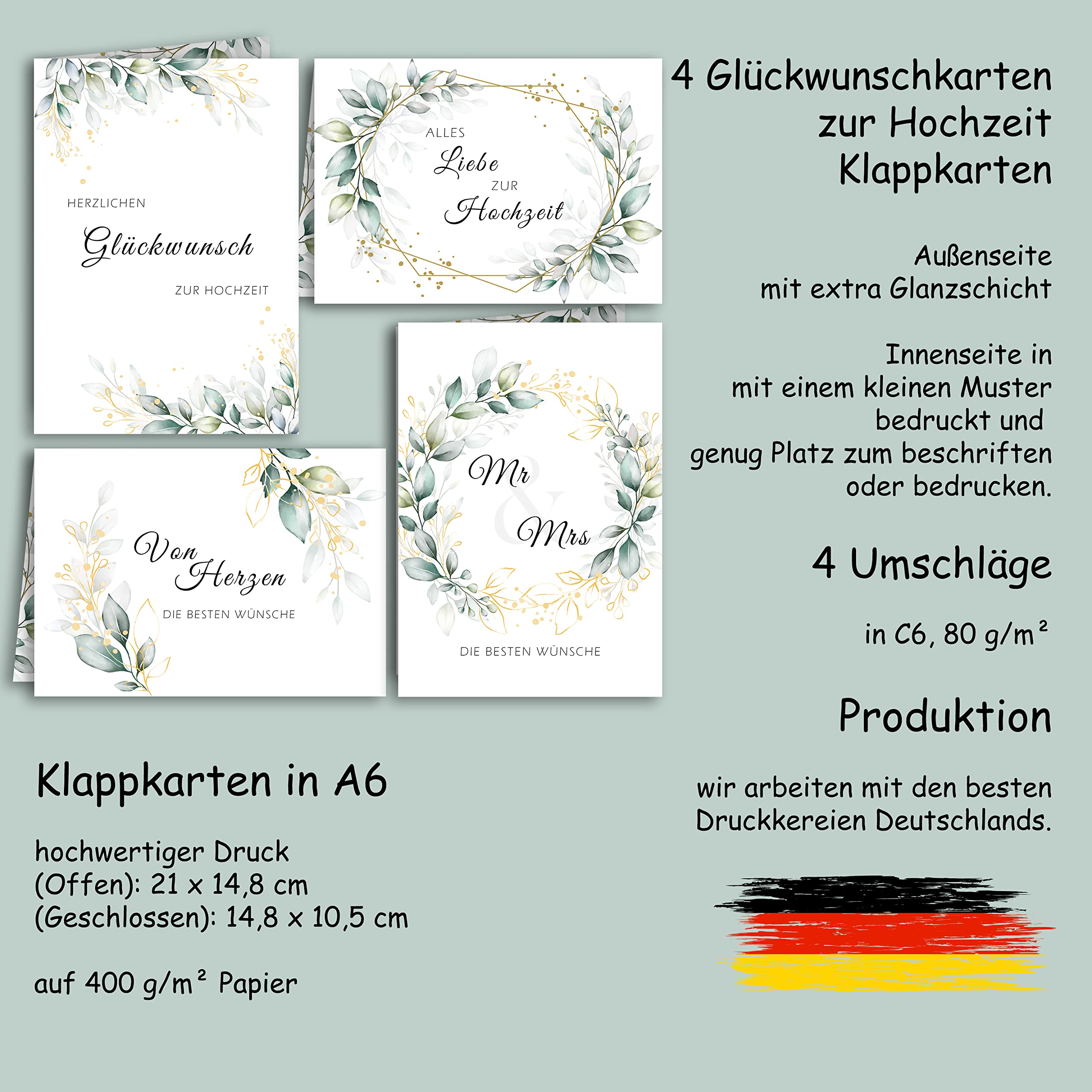 MADE IN GERMANY: Unsere Karten werden ausschließlich in Deutschland hergestellt. Dieses exquisite 4er Hochzeits-Grußkarten-Set im zarten Rosen-Design verkörpert die Schönheit einer Hochzeit. VERWENDUNG: Hochzeit, Glückwunschkarten, Glückwunschkarten Zur Hochzeit Hochzeitskarte Glückwunschkarte Karte Zur Hochzeit A4 Mit Umschlag Aquarell Rosa Karten Set Hochzeit Dieses exquisite 4er Hochzeits-Grußkarten-Set im zarten Rosen-Design verkörpert die Schönheit einer Hochzeit. Hergestellt in Deutschland, auf hochwertigem 400 g/m Papier gedruckt und mit einen Ganzschicht versehen. Auch die Innenseite ist mit einem kleinen passenden Design versehen. Passende rosa Umschläge sind im Set enthalten KARTEN: Dieses Set besteht aus 4 Hochzeits - Glückwunsch - Klappkarten / Doppelkarten mit Umschlägen FORMAT: DIN A6 Klappkarten / Doppelkarte Hergestellt in Deutschland, auf hochwertigem 400 g/m Papier gedruckt und mit einen Ganzschicht versehen. Die Karten sind sehr fest und stabil, auf hochwertigen Qualitätspapier gedruckt, dadurch sehen diese sehr edel aus. Auch die Innenseite ist mit einem kleinen passenden Design versehen. Edition Seidel Set 4 exklusive Hochzeitskarten it feiner Goldprägung Große Auswahl neuer und gebrauchter Geburtstagskarten Set online entdecken bei