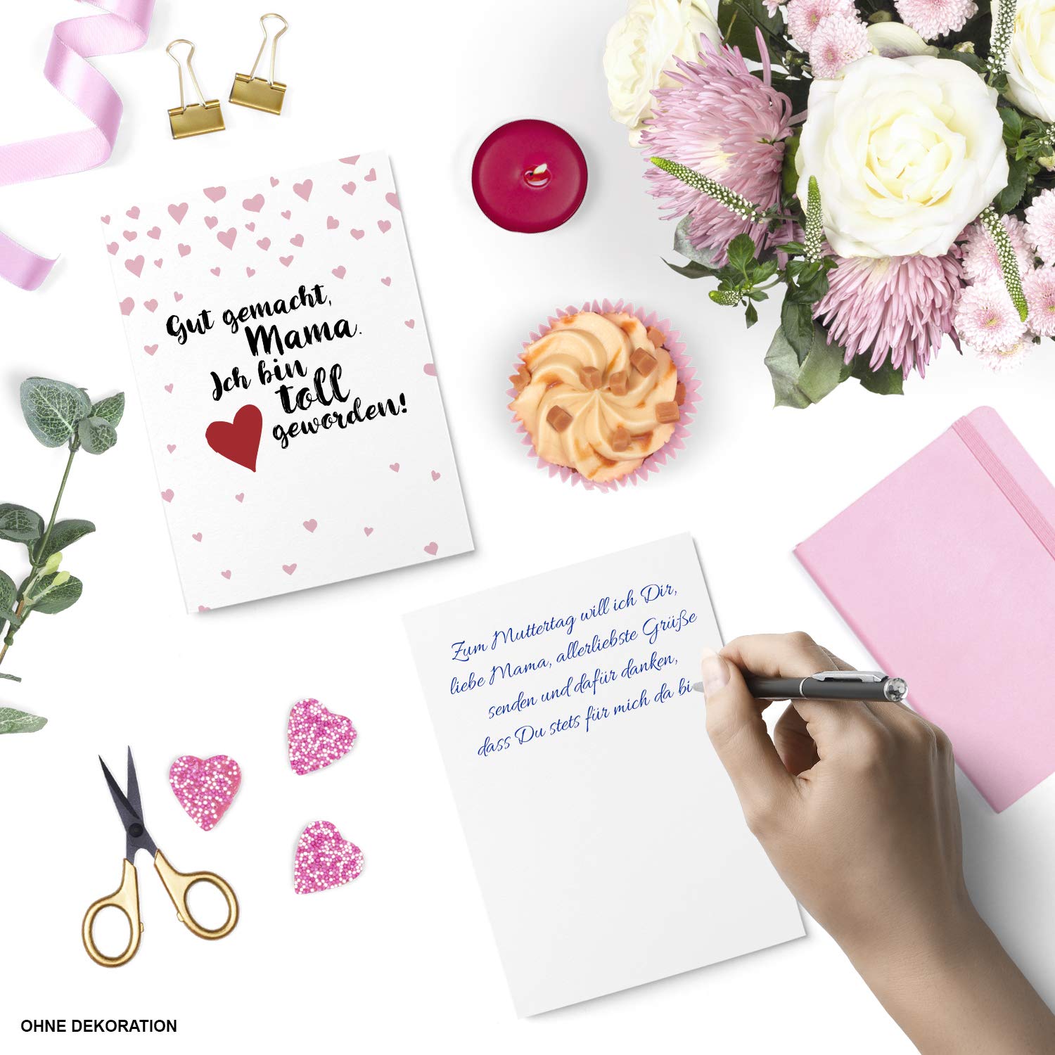 Muttertag-Sprüche: 70+ schöne Vorlagen Was schreibt man Schönes zum Muttertag? Vielleicht sind Muttertag-Sprüche etwas für dich? Vorgefertigt, kostenlos und kopierbereit. Denn das Buffet für die Glückwünsche zum Ehrentag der Mütter ist reichlich bestückt – mit schönen, berührenden, süßen, kurzen und lustigen Sprüchen. Und auch große Denker:innen, Verse aus der Bibel und... Für weitere Fragen sind wir immer für Sie da – auf Ihre Fragen wird schnell und indivuduell innerhalb von 24 Stunden geantwortet. Ihre Mama wird sich sicher sehr freuen und geschätzt fühlen. ✔ ZUFRIEDENE KUNDEN – Wir sind nur zufrieden, wenn Sie begeistert sind. Sie erhalten:- 1 x Postkarte mit Motiv Rosa Herz - Engel ohne Flügel, Rückseite frei zum Beschreiben- 1 x passenden, weissen Umschlag Sie haben so alle Möglichkeiten, zum Beispiel auch um einen Gutschein zu basteln, Ihren persönlichen Text zu schreiben oder Fotos aufzukleben. ✔ KARTE FÜR MAMA - Unsere Muttertagskarte im Postkarten Format (2-seitig) mit Umschlag ist eine tolle Möglichkeit, um der Mutter zum Muttertag zu gratulieren. Postkarte „Mama, du bist wundervoll – Geschenk für Mama – Verena von Heldenglück Karte Danke Geburtstag Geschenk Für Beste Freundin Herzliche Grußkarte: Alles Gute Zum Muttertag Geburtstag Geschenk Für Mutter Danke Karte Einladungskarten Manufaktur Hamburg Muttertag Karte | Postkarte zum Muttertag für Mama mit Spruch | Ich bin froh | Muttertagskarte zum Geschenk oder als Gutschein mit Umschlag günstig auf - Große Auswahl von Top-Marken Die Muttertagskarte wird gedruck auf bestem Chromokarton.