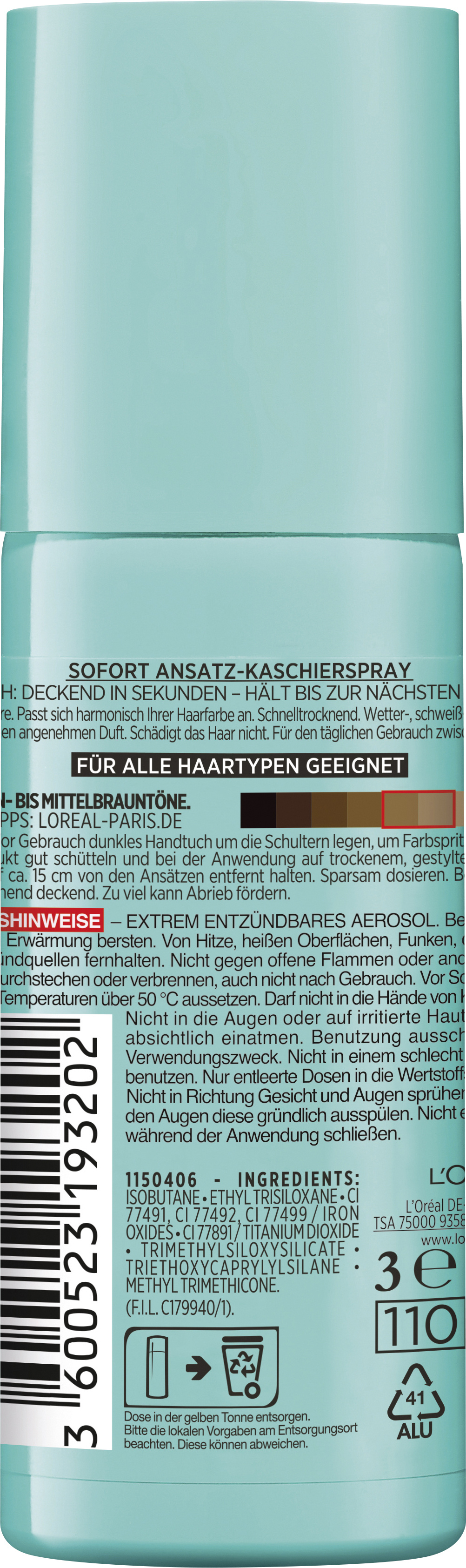 LOREAL MAGIC RETOUCH PRECISION TOUCH-UP MASCARA FÜR DEN HAARANSATZ BROWN 8ML BROWN | - Internetdrogerie, Onlinedrogerie, Shop, billige Kosmetika L'Oreal Paris Magic Retouch Ansatz-Kaschierspray Goldbraun eignet sich für braunes bis mittelbraunes Haar und kaschiert selbst graue Haaransätze in nur 3 Sekunden. Produktbeschreibung L'Oréal Paris Magic Retouch: Sofort Retouch-Spray Effekt bis zum nächsten Haarwaschgang Cool Bronze Gebrauchsanweisung Sprühen Sie das Produkt gleichmäßig auf das Haar. Mit dem L'Oreal Paris Magic Retouch Ansatz-Kaschierspray kaschieren Sie selbst graue Haaransätze schonend und harmonisch. 3 Sekunden sprühen und Ihre Haare sehen wieder perfekt aus Natürliche Unterstützung für Ihre Ernährung , Energiebooster im Alltag , Verantwortungsvolle Inhaltsstoffe Der Ansatzkorrektor L’Oréal Paris Magic Retouch hilft Ihnen beim Kaschieren des Ansatzes oder grauer Haare, vereinheitlicht den Farbton und hält bis zum nächsten Haarewaschen. Er kaschiert einfach und schnell Farbfehler in der Frisur, ohne das Haar zu beschweren Mit diesem handlichen Helfer sind spontane wichtige Verabredungen kein Problem. Hairline Spray L'Oréal Paris Magic Retouch Rauschspray Temporäre Farbgebung Loreal Magic Retouch Spray Einfach Dose kurz schütteln, sprühen und der Haaransatz ist kaschiert.
