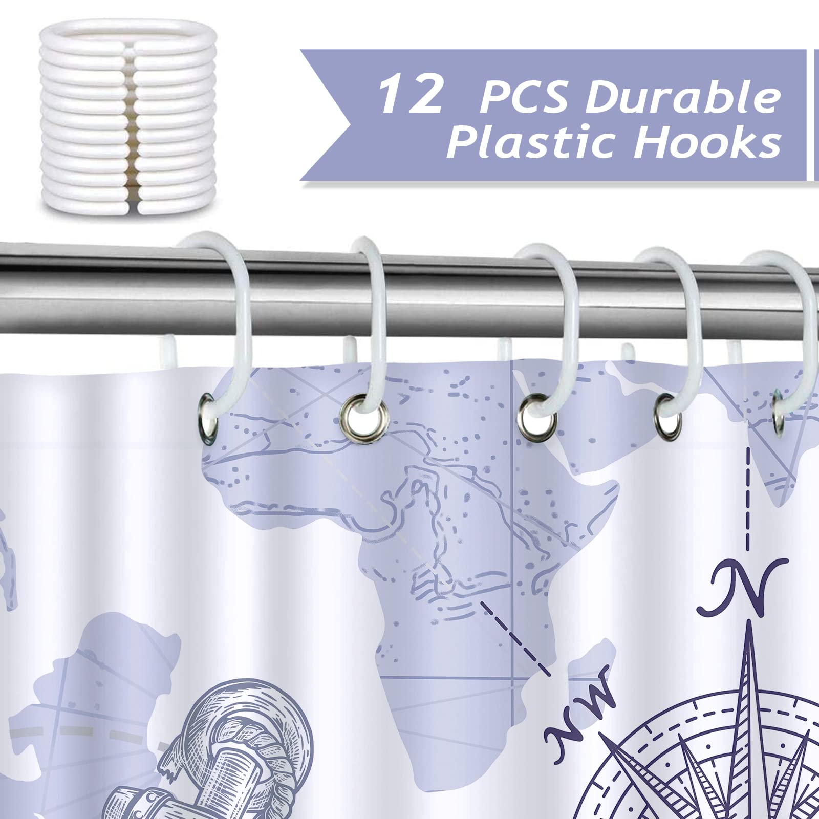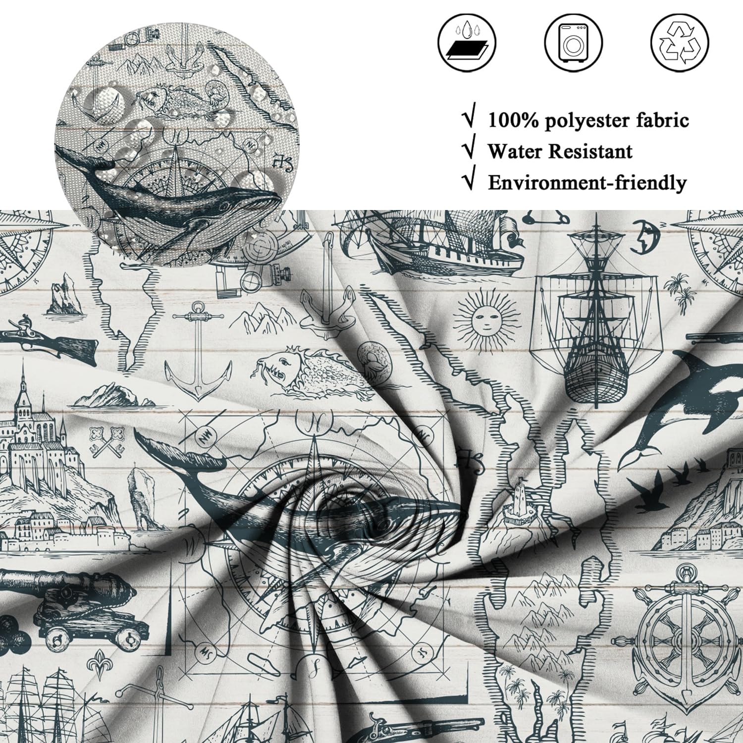 ASDCXZ Maritim Duschvorhang 180x180 Cm, Maritim Nautische Tagebuch Segelboot Anker Kompass Meerestiere Waschbar Bad Duschvorhänge Polyester Textil Wasserdicht Duschvorhang Für Badewanne Mit 12 Haken