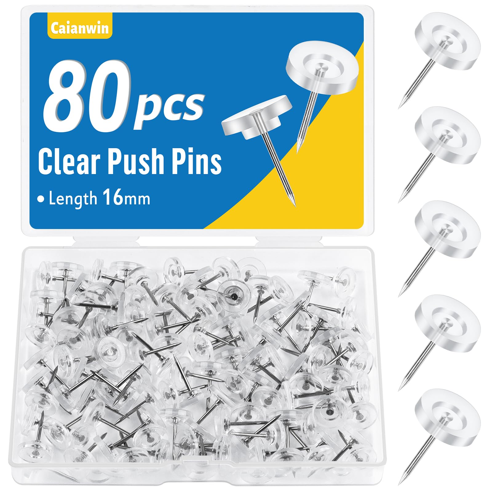 Caianwin 80 Stück Reiszwecken Mit Kopf,Reißzwecken Transparente,16mm Pinnadeln Heftzwecken Weiß Reissnägel Mit Aufbewahrungsbox Für DIY,Wandkarten,Bulletin Board,Kork Boards