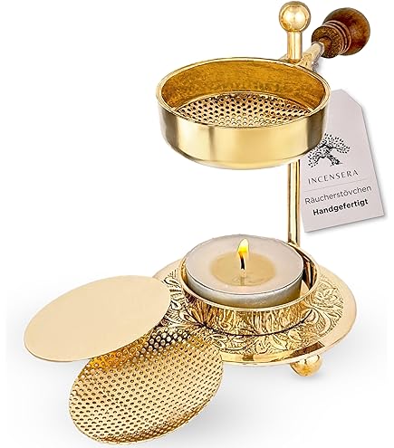 Räucherpfanne Weihrauchbrenner Messing XXL Räuchergefäß 5-tlg Set NKlaus Windlicht 5 Meter Petroleumlampe Docht 4,5mm 1291 für flüssige Harze, Weihrauch und Kräuter Räucherkerzen Für Räuchermännchen NKlaus 3 Stück Silberne Weihrauchbrenner Plättchen Für Metallplättchen Selbstklebend Durch die Wärme des Teelichts wird das Räucherwerk erhitzt, bei dieser Methode entwickeln sich Duftnote und die Wirkung sanfter. Ätherisches Öl destillieren mit Harz: wie funktioniert das Sicherheitshinweise:Kerze nie unbeaufsichtigt brennen lassen!