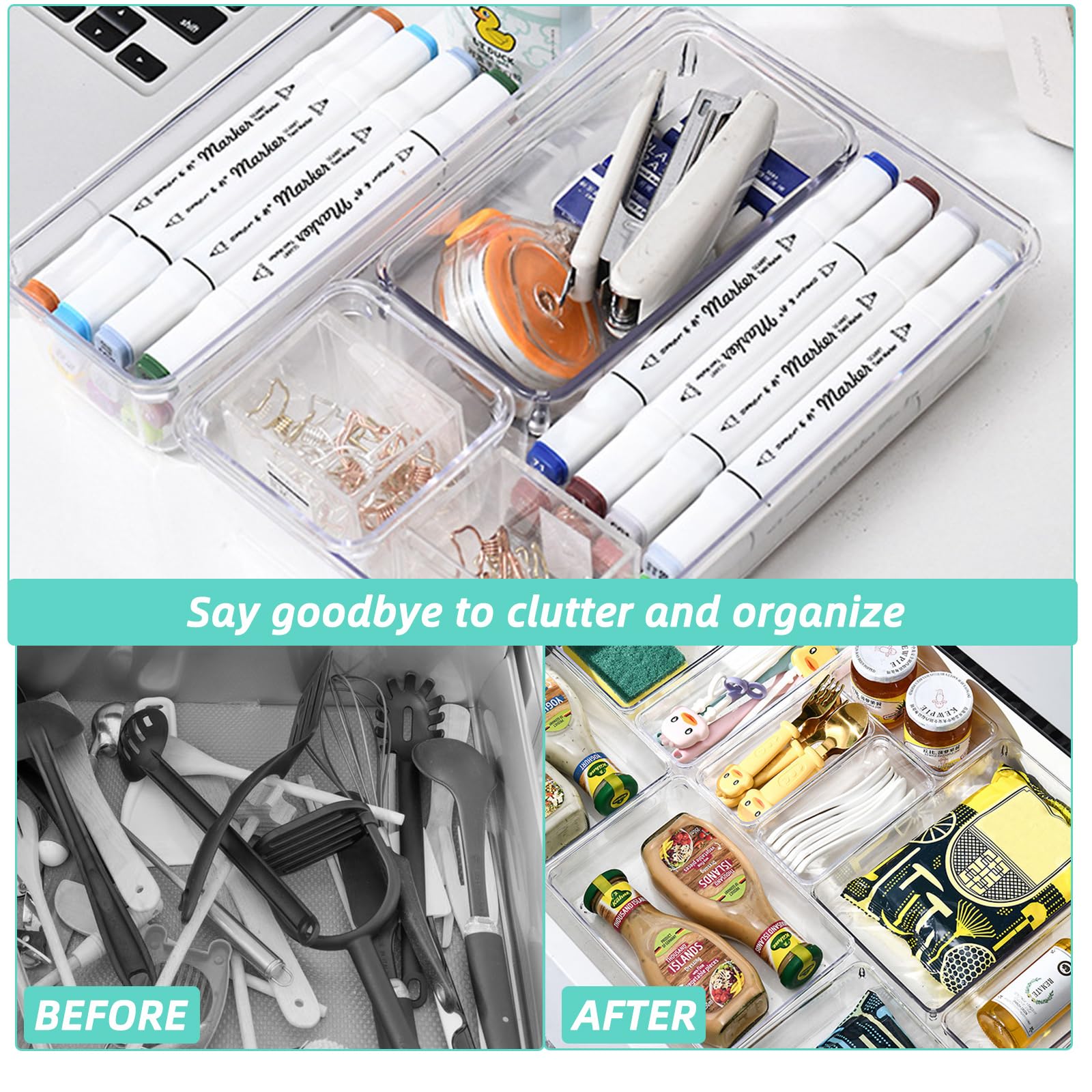Stapelbares Design: Entwickelt, um sicher zu stapeln, können diese Mülleimer in Schubladen oder auf Arbeitsplatten verwendet werden, um Platz zu sparen oder nebeneinander für einfachen Zugang und Organisation zu verwenden. Verwandeln und organisieren Sie Ihren Raum mit diesen transparenten Schubladenbehältern, die für jeden Aufbewahrungsbedarf entwickelt wurden. Premium-Qualität: Hergestellt aus dickem, starkem Kunststoff, BPA-frei für eine lange Lebensdauer, und einfach von Hand zu waschen für mühelose Reinigung. Schminktisch Organizer APACALI 15 Stück Schubladen Ordnungssystem Mit 5 Größen, Schubladen Organizer, Einsetzbar, Antirutsch Schubladen Organizer Veranstalter Für Makeup, Küchen, Bad, Büro Organizer Schminktisch Schubladen Organizer aus Kunststoff werden in einer Vielzahl an Formen und Größen angeboten. Doch nicht nur allein aufgrund dieses Angebots halten Produkten aus Plastik und Co zahlreiche Vorteile bereit Das stapelbare, rutschfeste Design sorgt dafür, dass sie sicher an Ort und Stelle bleiben und gleichzeitig Ihre Aufbewahrungsbedürfnisse maximieren. Vielseitige Organisation: Diese Schubladenbehälter sind perfekt für die Organisation einer Vielzahl von Gegenständen wie Make-up, Utensilien, Bürobedarf, Junk-Schubladenaufbewahrung, Schmuck, kleine Werkzeuge, Bastelbedarf, Soßenpakete, Teebeutel, Kosmetika. Perfekt für Küche, Bad, Büro oder überall sonst in Ihrem Zuhause. Rutschfest: Das dicke Acryl-Design sorgt für eine stabile, rutschfeste Innenseite von Schubladen oder auf Oberflächen. Diese Behälter sind aus robustem, BPA-freiem Kunststoff gefertigt und verfügen über ein klares Design, mit dem Sie Ihre Gegenstände auf einen Blick sehen können. 15 Stücke Schubladen Ordnungssystem mit 4 Bis zu 50% reduziert Kunststoff Schubladen-Organizer online kaufen bei » Große Auswahl Top Marken Top Service Ratenkauf & Kauf auf Rechnung » Jetzt bestellen
