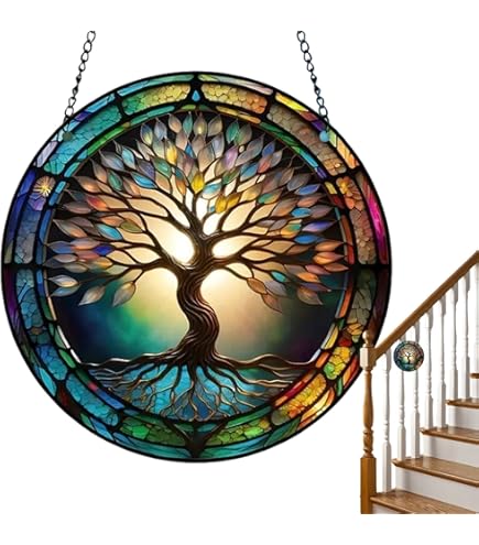 Herbstdeko Fenster Hängend DRWSSR Baum Des Lebens Natur Rund Große Bäume Und Sterne Mond Sonnenfänger Hängende Dekoration Mit Metallkette Sonnenfänger Für Fenster Dekor Outdoor Garten Dekor Geschenk Buntglas Sonnenfänger Vielseitige Dekoration: Ideal für den Einsatz als Glasfensteraufhängung, dieser Sonnenfänger erhellt Ihren Raum mit lebendigen Farben, wodurch er sowohl für... Wegen verschluckbarer Kleinteile nicht für Kinder unter 3 Jahren geeignet. Einzigartige Form: Mit einem skurrilen Design ist dieser 20 cm große Glas-Sonnenfänger perfekt, um Ihrer Terrasse, Ihrem Rasen oder Ihrem Garten einen festlichen Touch zu verleihen und sowohl Innen- als auch Außendekoration zu verschönern. Mehrfarbiger Glas-Kristall-Sonnenfänger Fensterkor, geeignet als Geschenk für Zuhause/Garten/Halloween/Muttertag, Heimkoration, Raumkoration, Wandkoration 2D Flach - 1 Stück, 2D Flachdruck, Bunter Baum des Lebens Suncatcher (22,86 cm x 22,86 cm), Regenbogen Dekoration, Natürliche Inspiration, Spirituelles Symbol, Heilungs-Schmuck, Baum des Lebens Kunst Vielseitige Dekoration: Ideal für den Einsatz als Glasfensteraufhängung, dieser Sonnenfänger erhellt Ihren Raum mit lebendigen Farben, wodurch er sowohl für Wandkunst im Innenbereich als auch für Terrassendekoration im Freien geeignet ist. 【Einfach aufzuhängen】 Der Glas-Sonnenfänger wird fertig zum Aufhängen mit einer befestigten Metallkette geliefert, wodurch er einfach an jedem Ort angezeigt werden kann, von Fenstern bis zu Wänden, drinnen oder draußen.