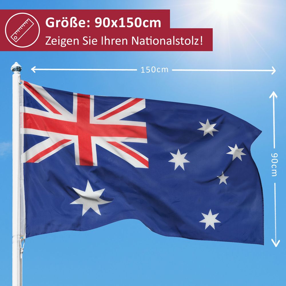 Australien Flagge Großformat 250 X 150 Cm Wetterfest Hissfertig mit drei Messingösen zum Aufziehen am Mast , Hohe Farbbrillanz Produktbeschreibung Australien Flagge - Großformat: 250 x 150 cm - wetterfest Set enthält: 1, Maße: ca., 150 x 250 cm , 100% reißfestes Polyester FLAGGE AUSTRALIEN 150x90cm - AUSTRALISCHE FAHNE 90 x 150 cm scheide für Mast - flaggen AZ FLAG feiner polyester. Flagge Australien ist mit scheide für Mast und werden aus feiner Polyester produziert Flaggenfritze Fahne/Flagge Australien - 150 x 250 cm + gratis Sticker, XXL-Fahne - Kostenloser Versand ab 29€. Jetzt bei bestellen Australien Ozeanien | Flaggen 90 x 150 cm | Shop - Flaggen und Fahnen Flagge Australien ist mit scheide für Mast und werden aus feiner Polyester produziert.