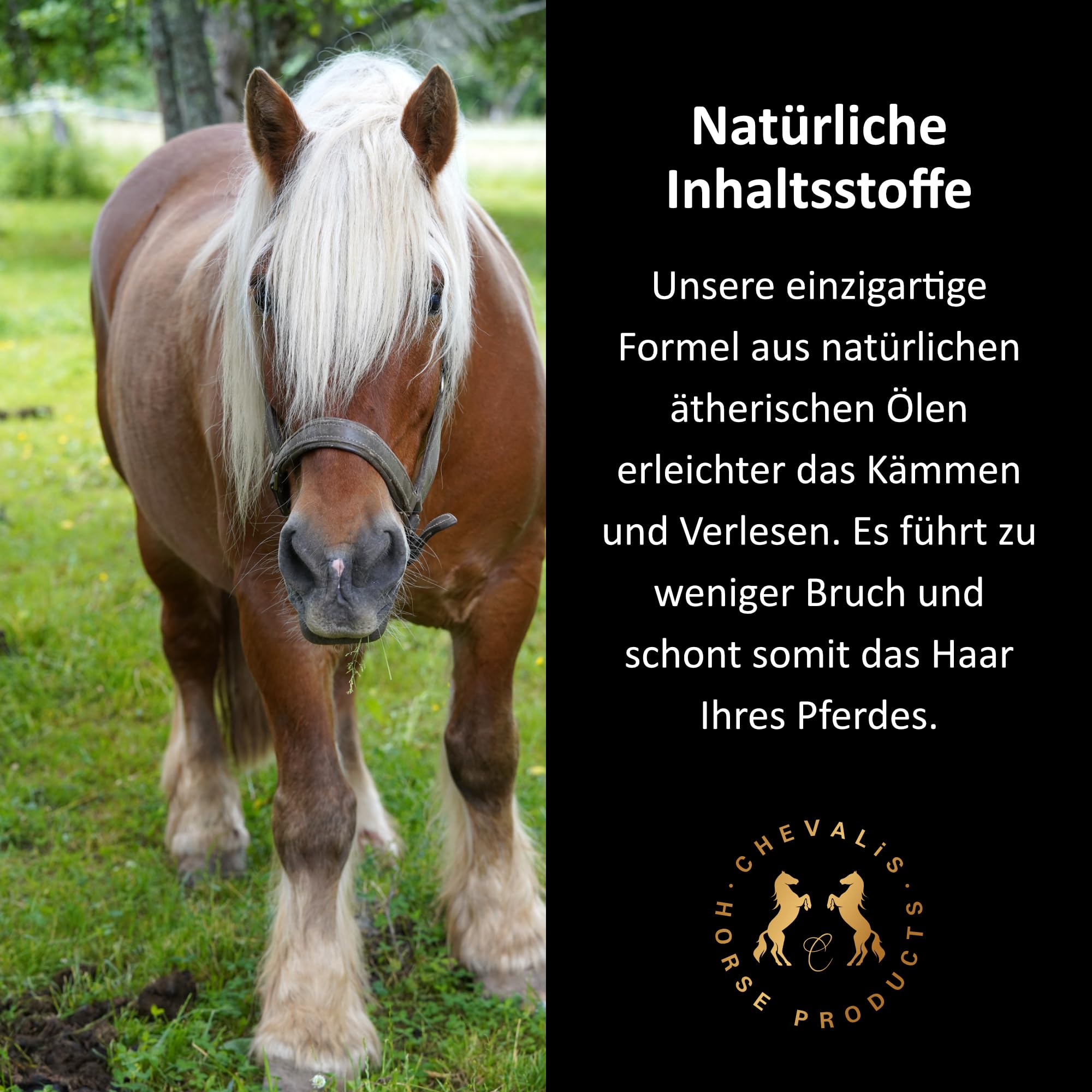 Gebrauchsanweisung Entfernen Sie Schmutz und Erde sorgfältig vom Fell Ihres Pferdes. Produktbeschreibungen CHEVALIS Pferde Mähnenspray Himbeere für Schweif & Mähne, sanfte Fell-Pflege und leichte Kämmbarkeit, Vegan mit ätherischen Ölen, ohne PEG und EDTA, 500ml ?? Strahlender Glanz & leichte Kämmbarkeit – Unser Mähnenspray erleichtert das Bürsten und Striegeln und kann vor Staub, Schmutz und Verklebungen schützen – für ein natürlich gepflegtes, glänzendes Fell. 😊 Ihre Zufriedenheit ist unser Versprechen – Wir stehen für geprüfte Qualität und bieten eine Zufriedenheitsgarantie, damit Sie und Ihr Pferd bestmöglich versorgt sind. Mähnenspray Für Pferde EMMA Schweif- & 2 * 500ml Fellpflege Pferd I Schweifspray Für Mähnen Schweif und Mähne - Funktion und richtige Pflege ???? Hergestellt in Deutschland – geprüfte Qualität – Unser Mähnenspray wird unter hohen Produktionsstandards hergestellt. Ergänzend bieten wir auch effektiven Insektenschutz für Ihr Pferd. ?? Natürliche Pflege in verschiedenen Varianten – Erhältlich mit Lemongrass & Eukalyptus, Lavendel & Kamille oder Himbeere. Lassen Sie das Spray kurz einwirken und trocknen, bevor Sie das Haar wie gewohnt bürsten. ?? Sanft & hautfreundlich – Die vegane, tierversuchsfrei entwickelte Rezeptur ist besonders mild zu Haut und Fell und eignet sich für die regelmäßige Anwendung. Mähnen- und Schweifspray für Pferde - Pflegespray ohne Silikone Pferdepflege leicht gemacht - EMMA Fellglanz-, Schweif- und Mähnenspray pflegt das Fell, die Mähne und den Schweif und verleiht ihm einen seidigen, langanhaltenden Glanz, der gleichzeitig schmutzabweisend wirkt