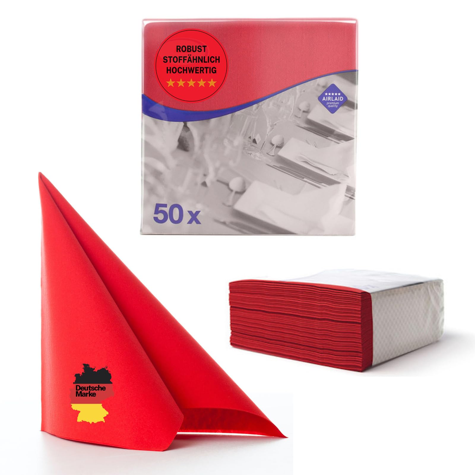 MONOUSO - Papierservietten 40x40cm 1/8 2-lagige Weiß (50 Stück) | METRO Weihnachtliche Tischdeko 20 Stück Servietten Rot, 2-lagig Table Papierservietten Deko,Gefaltet, 33x33cm Servietten Aus Watte Einweg-Papier Für Hochzeit,Cocktailservietten Kommunion, Braut, Geburtstag, Party, Abendessen Servietten Schwarz Vielseitig einsetzbar – Diese Papierservietten sind ideal für den täglichen Gebrauch zu Hause, in Restaurants oder bei besonderen Anlässen wie Geburtstagen, Hochzeiten und Firmenfeiern. Sanft und saugfähig – Die weiche, aber strapazierfähige Struktur sorgt für ein angenehmes Hautgefühl und eine hohe Saugfähigkeit, sodass Flecken und Feuchtigkeit schnell aufgenommen werden. Foto über Drei rote Papierservietten, Servietten gefaltet zu den Dreiecken und auf Weiß lokalisiert. rote Servetten falten - Nkolaus-Männchen basteln | Dy chrstmas... Hygienisch und bequem – Einwegservietten bieten eine hygienische Lösung für Gäste und Kunden, ohne aufwendiges Waschen – ideal für Gastronomie, Catering oder große Feiern. Papierservietten "Basic Rot" 2-lagig 40x40cm (50 Stück