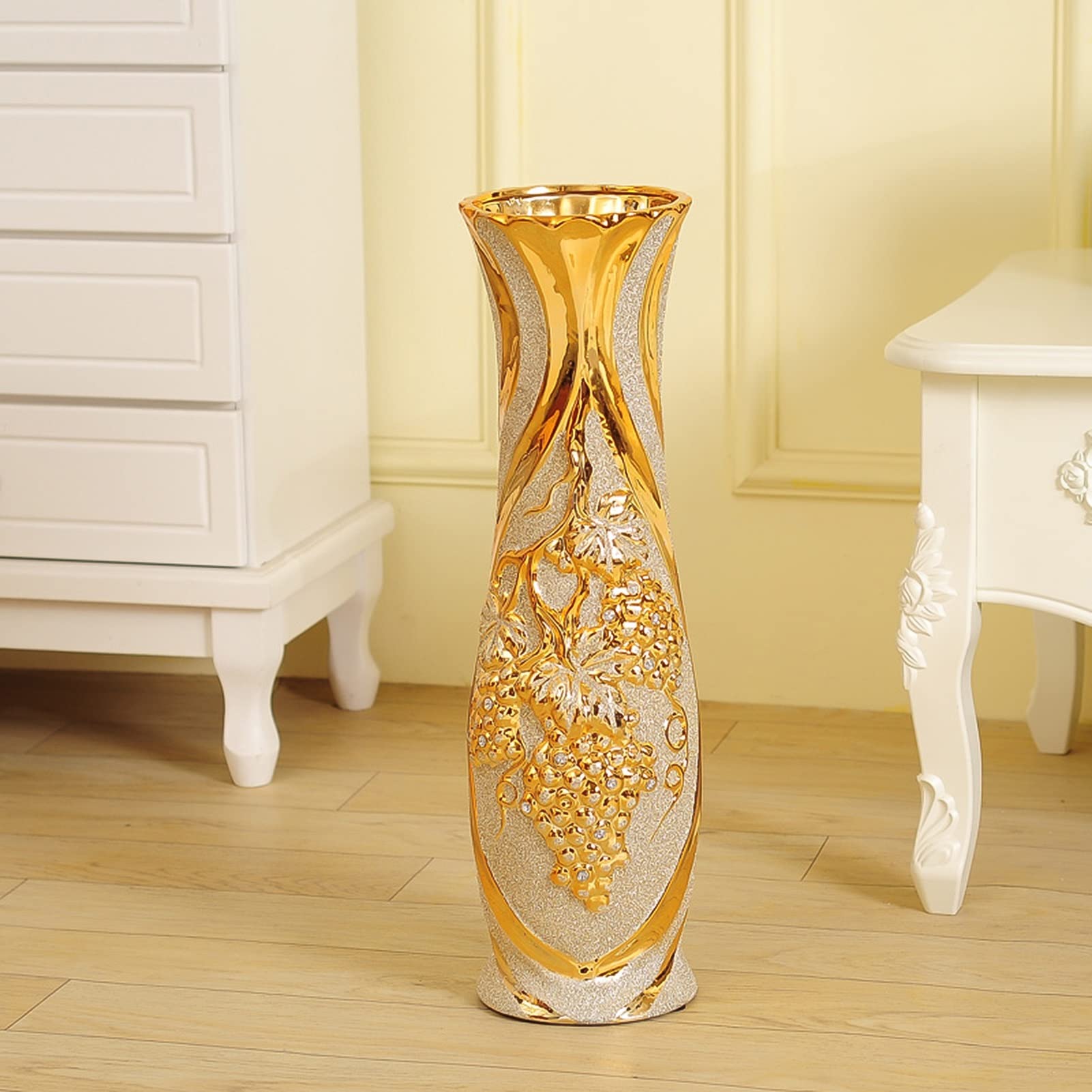 Perfekter Service: Da unsere Produkte während des Versandprozesses eine lange Zeit durchlaufen, wenn es irgendein Qualitätsproblem gibt, bevor Sie das Produkt erhalten, zögern Sie nicht, uns zu kontaktieren und wir werden unser Bestes versuchen, es zu handhaben, bis Sie zufrieden sind. Modernes Bodenvasen-Design: Hohe Bodenvase mit zweifarbigem Design, Silber oder Gold mit der glänzenden Beschichtung lässt die Vase eleganter und schicker aussehen, einzigartige hohle Form eignet sich für die Platzierung an jedem Ort. Wie Du mit einer hohen schmalen Vase Dein Zuhause verschönerst - www... Das Bild zeigt einen Gott aus griechischer Mythologie, der im unverwechselbaren Stil griechischer Vasenmalerei dargestellt wird. Luxuröse goldene Keramkvase | Ceramc vase, Gold ceramc, Gold vases Multifunktionale dekorative Vase: elegante und einfache Linien Bodenvase, kann als Statue verwendet werden, um auf die Arbeitsplatte als dekorative Skulptur zu stellen oder zum Füllen von langstieligen Blumen, Schilf, dekorativen Zweigen, getrockneten Blumen und anderen Blumensträußen, ideal für die Hochzeitsszene, Einweihungsfeier und Familiendekoration, Esstisch, Eingangskonsole, Kaminsims, Wohnzimmerboden, Korridorecke, Badezimmer, Büro, Balkon, Wohnzimmer, um Ihre Heimdekoration eleganter und exquisiter zu machen, sieht auffälliger aus., ing Ideales Geschenk: Keramik-Bodenvase, einzigartige moderne Vase, hochwertige handgefertigte Keramikvase für alle Stile und Anlässe, elegante Wohnzimmervase, perfektes Geschenk für Lieben, Eltern, Freunde als Hochzeit, Erntedankfest, Geburtstag, Jubiläum, Einweihungsparty, Feier und Urlaub, lassen Sie sie ihre Fantasie mit ihrem Lieblings-Pampasgras, getrockneten Blumen, Zweigen, Blumensträußen nutzen, um elegante Raumästhetik zu schaffen. Vasenmaterial: Hergestellt aus hochwertiger Keramik, handgeschnitzt, fein bei hoher Temperatur gebrannt, geruchlos und pflegeleicht, verwenden Sie einfach ein weiches Tuch für einfache Reinigung oder schnelles Staubwischen. große Vase 30 cm Hyalithglas Schwarzglas Blumendekor Vasengröße: [L] 17,5 cm L, 9 cm B, 50,8 cm H [M] 27,9 cm L, 9 cm B, 38,1 cm H. Deko Schwarz Gold Schöne Schwarze Vase Morne Keramikvase Isoliert Auf Weißem Casa Deco der auffallende Kontrast zwischen Schwarz und.