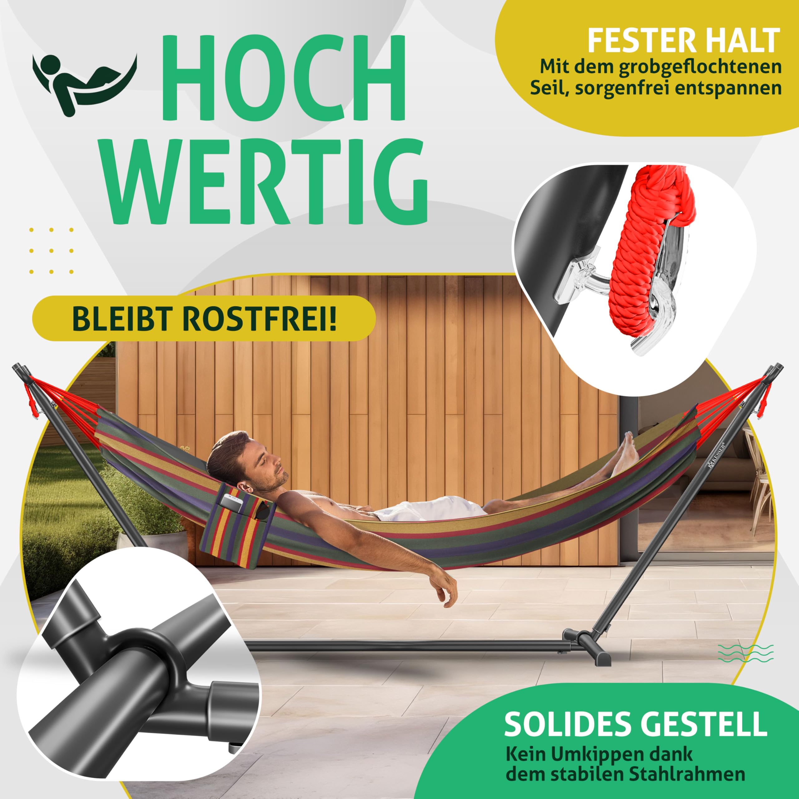 Sie können eine Freizeit auf einer Hängematte mit Ihrem Kumpel, Ihren Kindern und Ihren Freunden genießen. Jedes Seil besteht aus Polyester- und Baumwollfäden, die haltbarer und sicherer sind. - Verpackungsgröße: 150 x 28 x 17 cm (L x B x H). Hängeatte it Sonnenschutz – Die 15 besten Produkte i Vergleich... Robuster Ständer: Der Hängemattenständer ist aus pulverbeschichtetem schwerem Stahl gefertigt, sicher, langlebig und wetterfest. Lieferumfang: - 1 x Hängemattenständer, 3,6 m. CHICO Doppelhängematte mit Klappständer | Kaufen auf Ricardo Es kann in wenigen Minuten ohne Werkzeug montiert werden. VEVOR Hängematte für 2 Personen - 1 x abnehmbares Kissen. 【Hartholz-Spreizstange】140,5 cm Hartholz-Spreizstange hat versenkte Löcher, reduziert die Reibung zwischen Seil und Holz, bietet maximale Haltbarkeit und Stabilität. 【Bequem und langlebig】Doppelschichtiges gestepptes Polyestergewebe mit innerer Polyesterwatte ist weich, atmungsaktiv und langlebig. - 2 x integrierte Ketten. - Länge der Spreizstange: 139,7 cm. Spezifikationen: - Material: Polyester, Polyesterwatte, Hartholz, Stahl - Gesamtmaße (L x B x H): 366 x 139 x 111 cm. Hängematte für zwei Personen: Die Größe des Hängemattenbetts beträgt 199,9 x 139,7 cm. Extra Polyethylen-Füllung Kopfkissen bieten Ihnen überlegenen Komfort. Songmics Hängematte Mit Gestell Mophorn Doppel-Hängematte Aus Gestepptem Stoff, 3,6 M, Doppel Hängematte Mit Gestell Xxl Diese 3,6 m Hängematten-Kombi ist sehr geeignet zum Lesen, Entspannen und Ausruhen im Garten, Terrasse, Hinterhof, Pool oder Balkon. - 1 x Hängematte aus gestepptem Stoff. Suchmaschinenoptimierung, Google ADs, Webdesign, Onlineshop, Softwareentwicklung