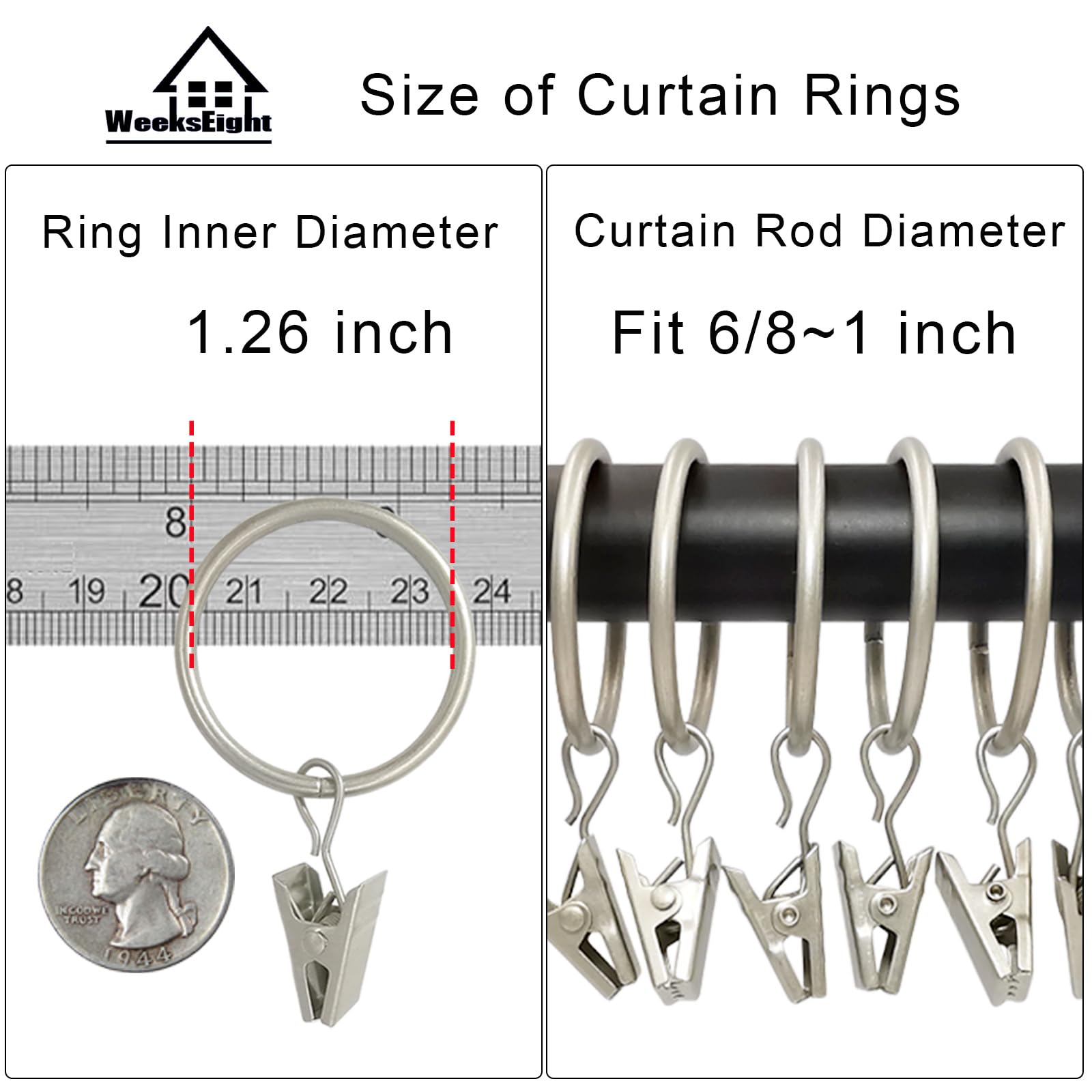 WeeksEight Vorhangringe mit Clips, Vorhanghaken Die Vorhang-Clips mit Ringen verleihen jedem Raum einen raffinierten Sinn für Stil, perfekt für Schlafzimmer, Wohnzimmer, Esszimmer, Büro oder Küche, Café. Vorhang-Clip-Ringe: Starker Spannclip für schwerere Anwendungen, robustes Design, stärkerer Spannclip hält schwerere Vorhänge ohne Probleme. Bitte beachten Sie: Diese Ringe passen auf Gardinenstangen mit einem Durchmesser von 2,5 cm oder kleiner. Machen Sie Ihr Leben voller Spaß., ! Vorhangringe lassen sich leicht gleiten: Vorhangringe mit Ösen Innendurchmesser 3,2 cm, Vorhangringe mit Clips für die Verwendung in einer 2,5 cm Gardinenstange... Ringe Aufhängung WeeksEight 40 Weiße Vorhangringe Mit Clips, Vorhanghaken, Aufhänger-Clip-Ringe Zum Aufhängen Von Vorhängen, Schleifen, Hüten, Vorhangringen 3,8 Cm I D, Passend Für Gardinenstangen Mit Einem Gardinenringe Metall Ringstärke 0,3 cm, passend für Gardinenstangen mit einem Durchmesser von bis zu 2,5 cm. Verleiht Ihren Vorhängen einen Hauch von Eleganz. Hängen Sie Ihre wunderschönen Vorhänge auf. Schaffen Sie eine komfortable und romantische Umgebung für Sie. Spezifikationen und Maße: Innendurchmesser 3,2 cm, Außendurchmesser 3,8 cm. Beste Lebensqualität WeeksEight Marke WeeksEight konzentriert sich auf die Entwicklung kreativer Heimprodukte. Wir wissen genau, was Sie brauchen. Design und Eigenschaften: Ideal zum Aufhängen von dicken Vorhängen, Kleiderbügeln, Stoffschleifen, Kappen oder Partydekorationen oder anderen Gegenständen, die organisiert werden müssen usw. Wir sind mehr besorgt über die Produkterfahrung des Käufers, damit der Käufer qualitativ hochwertigen Vorverkauf und Service bietet. Vorteile von uns: Hochwertige Metall-Vorhangringe mit Clips, langlebige Beschichtung für lange Lebensdauer, rostfrei, jeder Vorhangclip kann bis zu 1,4 kg tragen, Sie werden diese lieben – sie halten stark an Ihren schweren Vorhängen. Endlich Gardinen schnell und stabil aufhängen! Diese 100 silbernen Clips mit Kunststoffrädern passen auf die meisten Standard-Schienen