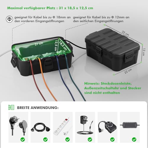 Wasserdichte Kabelbox Starkstrom Zeitschaltuhren, Verlängerungskabel Und Vieles Steckdosenverteiler Außen Wasserdchte Kabel onlne kaufen | OTTO AISVAN IP54 Wasserdicht Outdoor Stromkasten Wetterfest Verlängerungskabel zum Schutz der Steckdose Steckdose Steckdose Timer Stromband Urlaubslicht , Oberflächenart: lackiert , Artikelgewicht: 1,0 Pfund , Material: Kunststoff Wetterfeste Box für Außen zur sicheren Stromversorgung (Kabelbox wasserdicht IP54 zum Schutz von Steckdosen, Adaptern, Transformatoren usw.) Die wetterfeste Elektrobox mit den Maßen 34 x23 x12,5 cm für den Außenbereich verfügt über einen IP54-Schutz und verhilft somit zu einer sicheren Stromversorgung im Garten oder allgemein im Outdoor-Bereich Die wasserdichte Kabelbox bietet durch die... RESTMO große wasserdichte Kabelbox für den Außenbereich (Outdoor), IP54 wasserdicht, wetterfester Elektrokasten zum Schutz von Verlängerungskabel, Steckdosenleisten, Außensteckern (32x22x13cm)-Schwarz Besuche den Restmo-Store 4,7 (1.244) 3000+ gekauft Mal im letzten Monat Drehstrom Starkstrom Zeitschaltuhren, Verlängerungskabel und vieles mehr