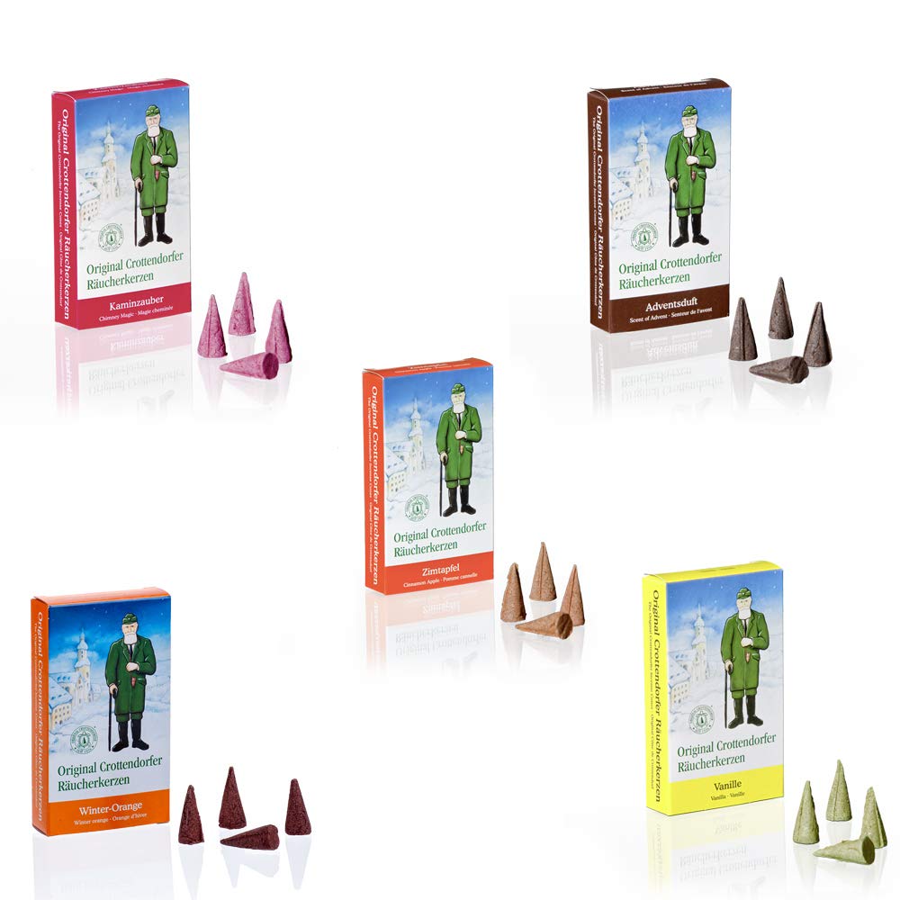 Das 5er Set besteht aus Kaminzauber Zimt Apfel Winter Orange Adventsduft Vanille. Qualität steht bei Crottendorfer an erster Stelle, denn Tradition verpflichtet. Jeweils 24 Räucherkerzen, insgesamt 120 Räucherkerzen., Traditionelle Weihnachtsdüfte , Hergestellt in Deutschland. Crottendorfer Räucherkerzen Weihrauch Crottendorfer Räuchermännchen 3 Päckchen Räucherkerzen- Adventsduft Weihrauch Zum Räuchern Crottendorfer ist es wichtig, die traditionellen Weihnachtsdüfte zu bewahren, die viele bereits aus ihrer Kindheit kennen. Dazu gehört auch, dass die Räucherkegel nabln, was bedeutet, dass aus den Räucherfiguren ein schneeweißer, aromatischer Rauch aufsteigt Crottendorfer ist es wichtig die traditionellen Weihnachtsdüfte, die viele schon aus ihrer Kindheit kennen, zu bewahren. Frisch-fruchtig-zitronig mit Karamellnoten Adventsduft. Dies bedeutet, dass keine abgedroschenen Varianten mit minderwertigen Rohstoffen produziert werden um ein günstigeres Produkt zu erhalten, sondern die Rezepturen aus den Anfängen nachgelieferter Rezepturen als Grundlage für Qualitätsprodukt Made in Germany übernommen werden. Räucherkerzen der Größe M, Brenndauer ca., 12 – 15 Minuten. Zum Einsatz kommen natürliche und naturidentische Duftstoffe wie Harze, Kräuter, Gewürze, Hölzer, Pflanzenauszüge, ätherische Öle, Duftstoffe für Allergiker und heimische Buchenkohle., Weihnachts-5er-Set. Crottendorfer Adventskalender Räucherkerzen mit 24 Weihnachts-5er-Set. Crottendorfer ist es wichtig, die traditionellen Weihnachtsdüfte zu bewahren, die viele bereits aus ihrer Kindheit kennen