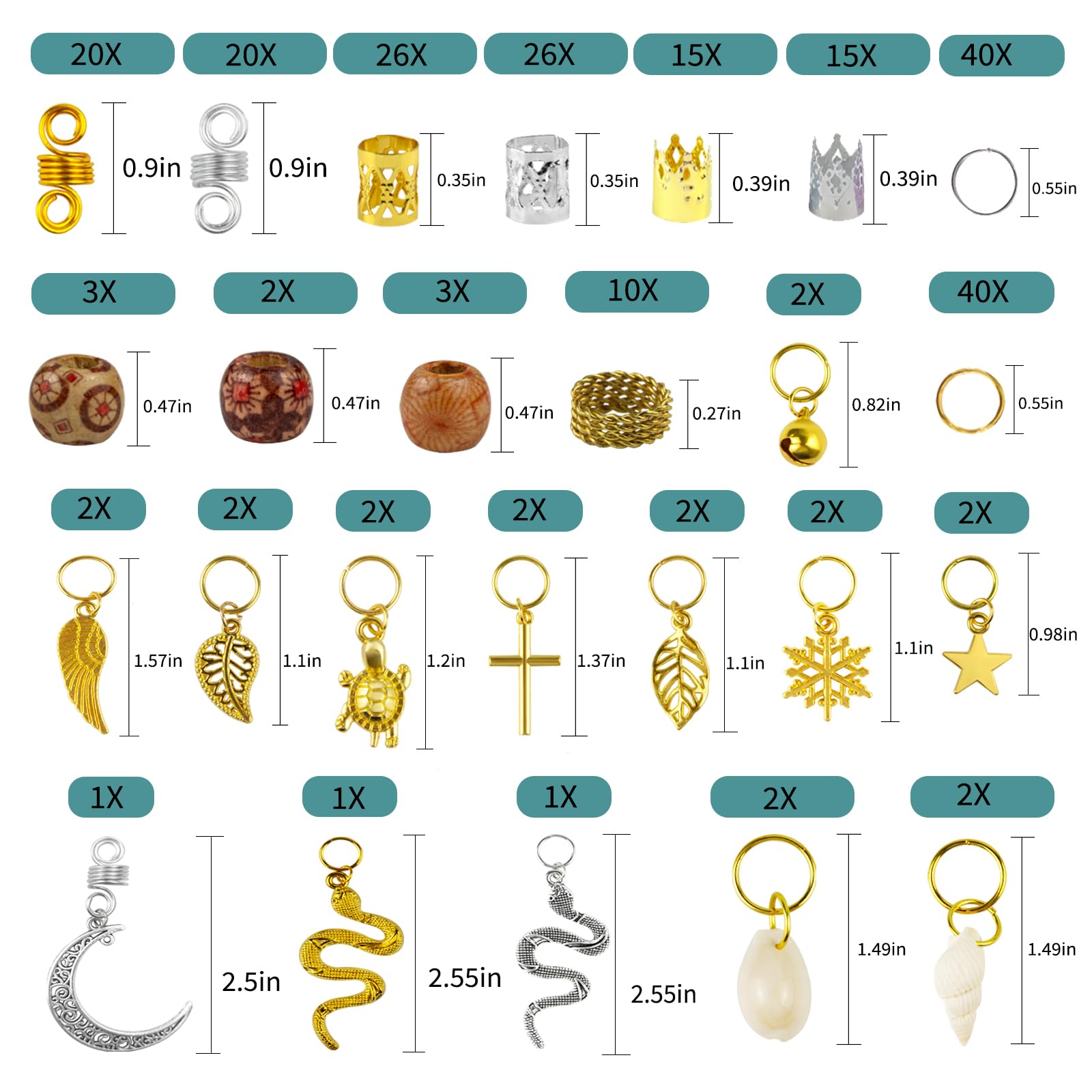 Qingchuang Haarschmuck Für Zöpfe Und Locs – Metall-Clips, Muscheln, Holzimitat, Charms, Verstellbare Manschetten, Ringe Für Frauen Und Mädchen, 241 Stück