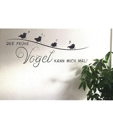 Unsere Wandaufkleber werden von uns selbst entworfen und produziert. 100% raufasertauglich und rückstandslos entfernbar. Wandtattoo Faultier und Eule mit Spruch der frühe Vogel kann mich mal M2045Größen:Größe S: 40cm breit x 22cm hochGröße M: 60cm breit x 32cm hochGröße L: 80cm breit x 43cm hochGröße XL: 100cm breit x 54cm hochDie Maße ergeben sich, wenn so verklebt wird wie abgebildet! Die Untergründe sollten latex- und silikonfrei sein. Mit wenigen Handgriffen können Sie Wände mit Wandtattoo's beleben, Sie können Jenseits der üblichen Möglichkeiten, Welten erschaffen oder eine besondere Art von Lebensgefühl zum Ausdruck bringen. Unsere Wandtattoos sind geeignet für Untergründe wie: Raufaser, Tapete, Metall, Glas, Kunststoff, Fliesen, Möbel und sogar Putz mit feiner Körnung. Unsere Wandtattoos und Wandaufkleber sind perfekt für Ihre Wohnraumgestaltung. Der frühe Vogel kann mich mal | Lifestyle by Bine Tjapalo® S-pkm362 Wandtattoo Schlafzimmer Spruch Träumen Der Frühe Vogel Kann Mich Mal (B58 X H33 Cm Unsere Wandsticker sind geeignet für Untergründe wie: Raufaser, Tapete, Metall, Glas, Kunststoff, Fliesen, Möbel und sogar Putz mit feiner Körnung. Markenqualität in Deutschland produziert,individuell anpassbar, einfache Montage,preisgünstig,bequem zu bestellen und einfach zu bezahlen! Der frühe Vogel kann mich mal! - Gartenratgeber Hauchen Sie Ihren Wänden Leben ein... unser Wandtattoo Faultier und Eule mit Spruch zaubert magisches Flair in jedes Zimmer! Unsere Wandtattoos und Wandaufkleber sind perfekt für Ihre Wohnraumgestaltung