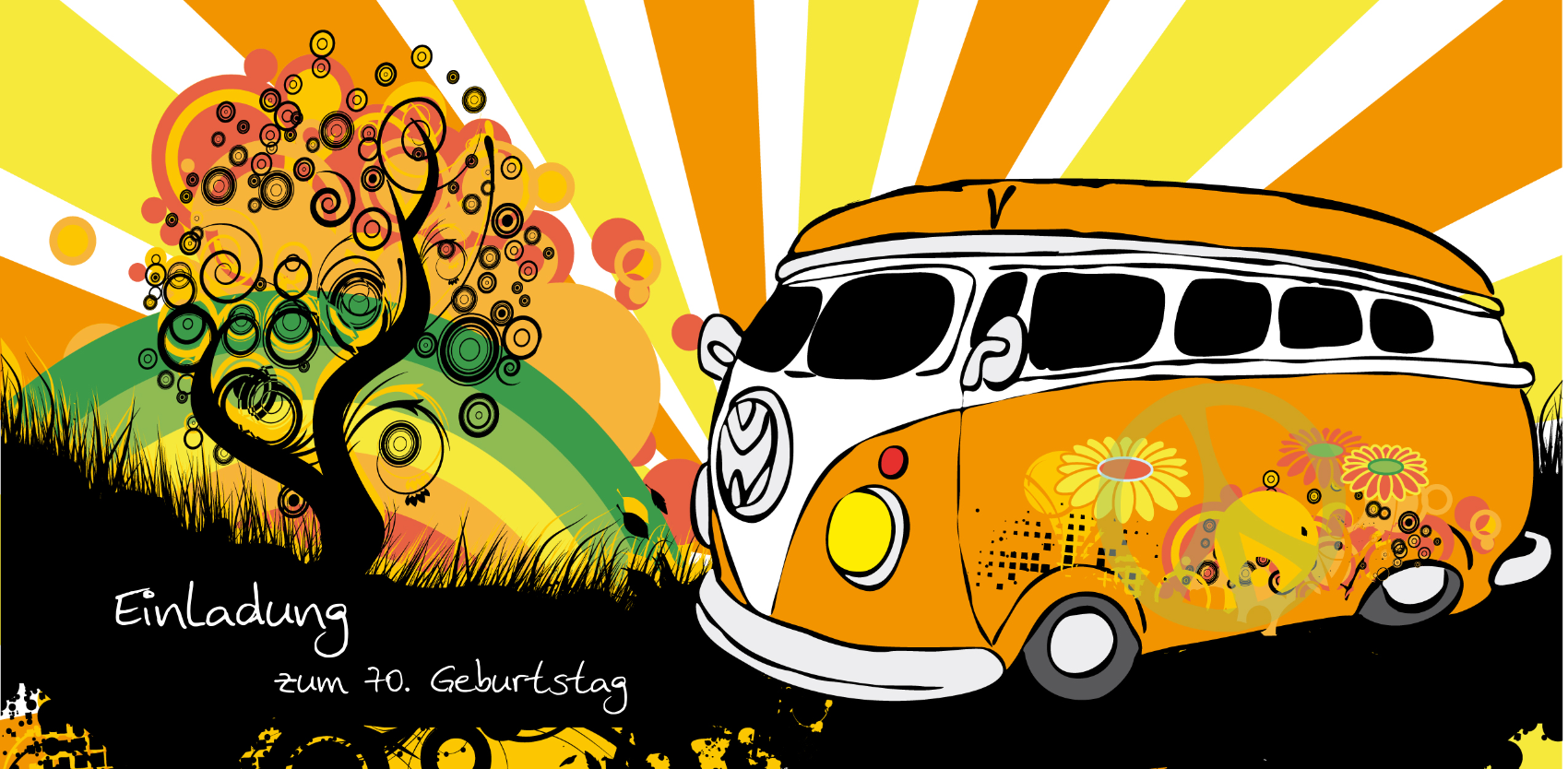 Einladung 70. Geburtstag "Heiko/Heike", Lange Karte Quer, Rund. Geburtstag